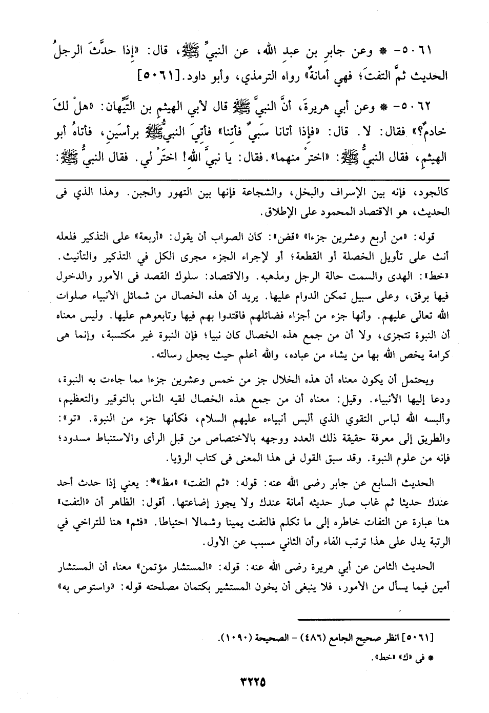 ويحتمل أن يكون معناه أن هذه الخلال جز من خمس وعشرين جزءاً مما جاءت به النبوة، ودعا إليها الأنبياء. وقيل: معناه أن من جمع هذه الخصال لقيه الناس بالتوقير والتعظيم، وألبسه الله لباس التقوى الذي ألبسه أنبياءه عليهم السلام، فكأنها جزء من النبوة. ((تو)): والطريق إلى معرفة حقيقة ذلك العدد ووجهه بالاختصاص من قبل الرأي والاستنباط مسدود؛ فإنه من علوم النبوة، وقد سبق القول في هذا المعنى في كتاب الرؤيا.