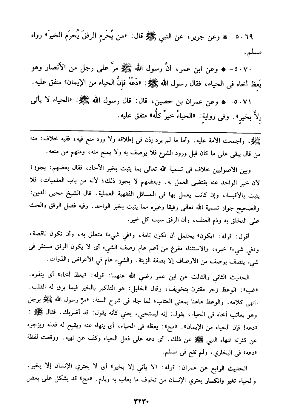 5070 - وعن ابن عمر، أن رسول الله صلى الله عليه وسلم مر على رجل من الأنصار وهو يعظ أخاه في الحياء، فقال رسول الله صلى الله عليه وسلم: ((دعه فإن الحياء من الإيمان)) متفق عليه.