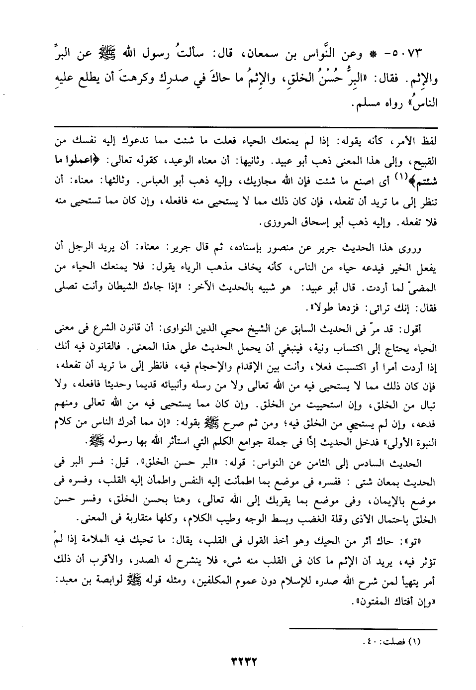 5073 - وعن النواس بن سمعان، قال: سألت رسول الله صلى الله عليه وسلم عن البر والإثم. فقال: ((البر حسن الخلق، والإثم ما حاك في صدرك وكرهت أن يطلع عليه الناس)) رواه مسلم.