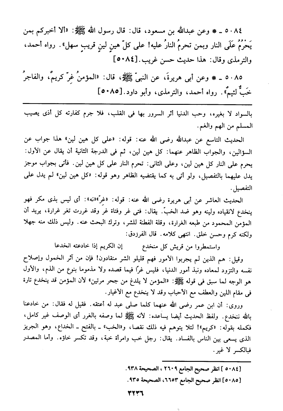 الحديث التاسع عن عبد الله رضي الله عنه: قوله: ((على كل هين لين)) هذا جواب عن السؤالين، والجواب الظاهر عنهما: كل هين لين، ثم في الدرجة الثانية أن يقال عن الأول: يحرم على النار كل هين لين، وعلى الثاني: تحرم النار على كل هين لين. فأتى بجواب موجز يدل عليهما بالتفصيل، ولو أتى به كما يقتضيه الظاهر وهو قوله: ((كل هين لين)) لم يدل على التفصيل.