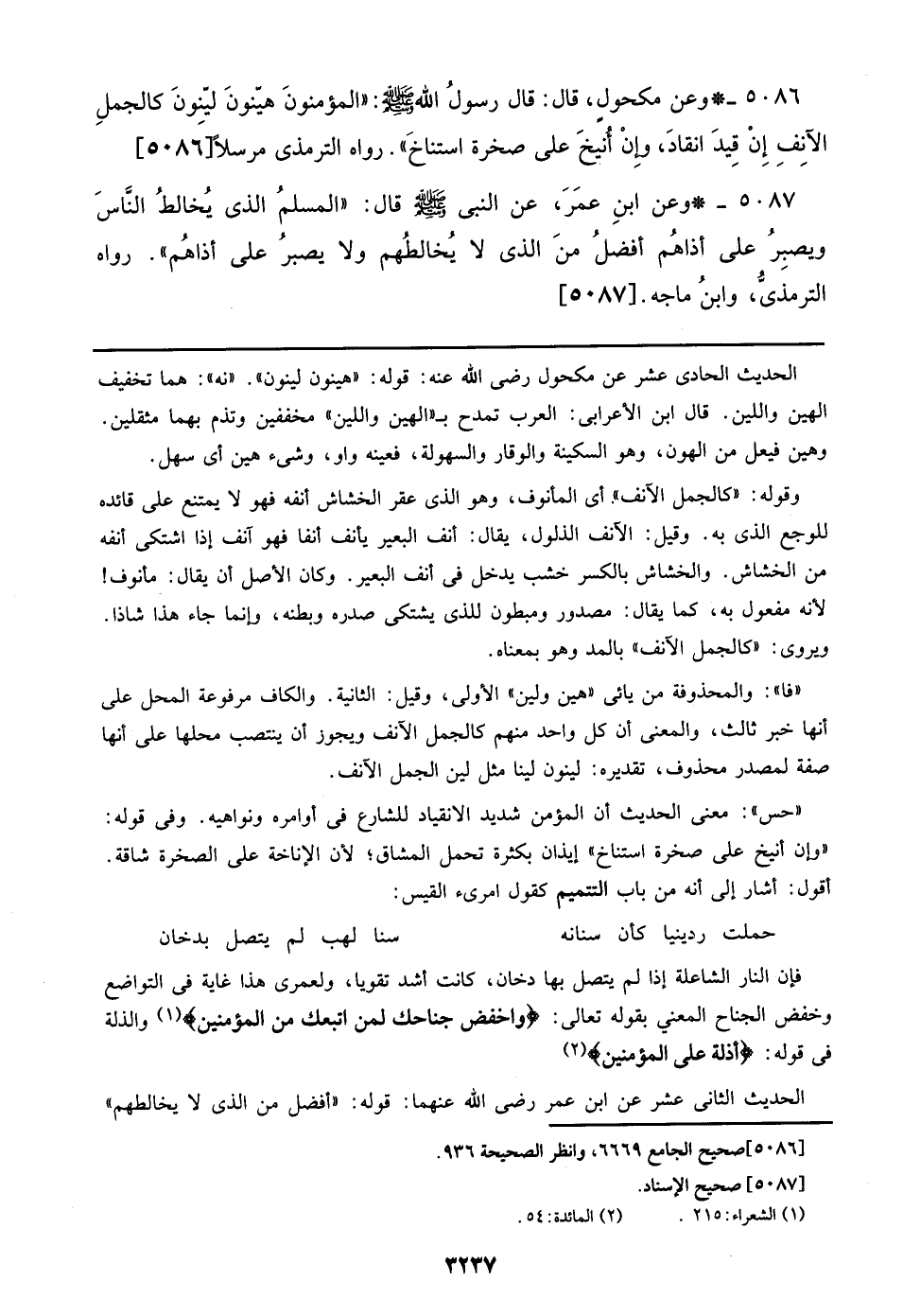 5086 - وعن مكحول، قال: قال رسول الله صلى الله عليه وسلم: ((المؤمنون هينون لينون كالجمل الآنف إن قيد انقاد، وإن أنيخ على صخرة استناخ)). رواه الترمذي مرسلاً [5086]