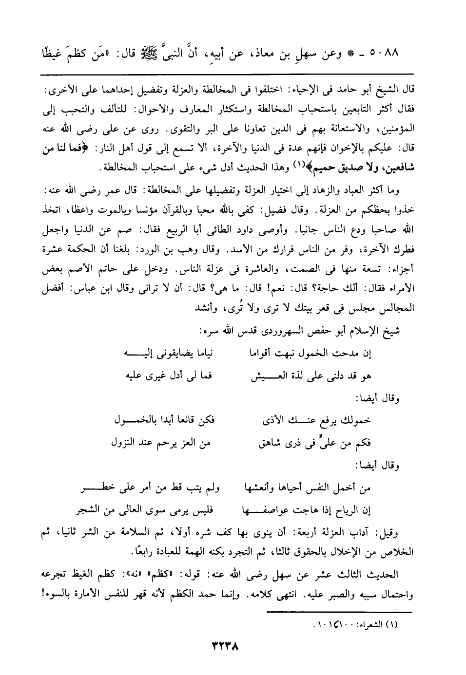 قال الشيخ أبو حامد في الإحياء: اختلفوا في المخالطة والعزلة وتفضيل إحداهما على الأخرى: فقال أكثر التابعين باستحباب المخالطة واستكثار المعارف والأحوال: للتألف والتحبب إلى المؤمنين، والاستعانة بهم في الدين تعاونا على البر والتقوى. روى عن علي رضي الله عنه قال: عليكم بالإخوان فإنهم عدة في الدنيا والآخرة، ألا تسمع إلى قول أهل النار: {فما لنا من شافعين، ولا صديق حميم} وهذا الحديث أدل شيء على استحباب المخالطة.