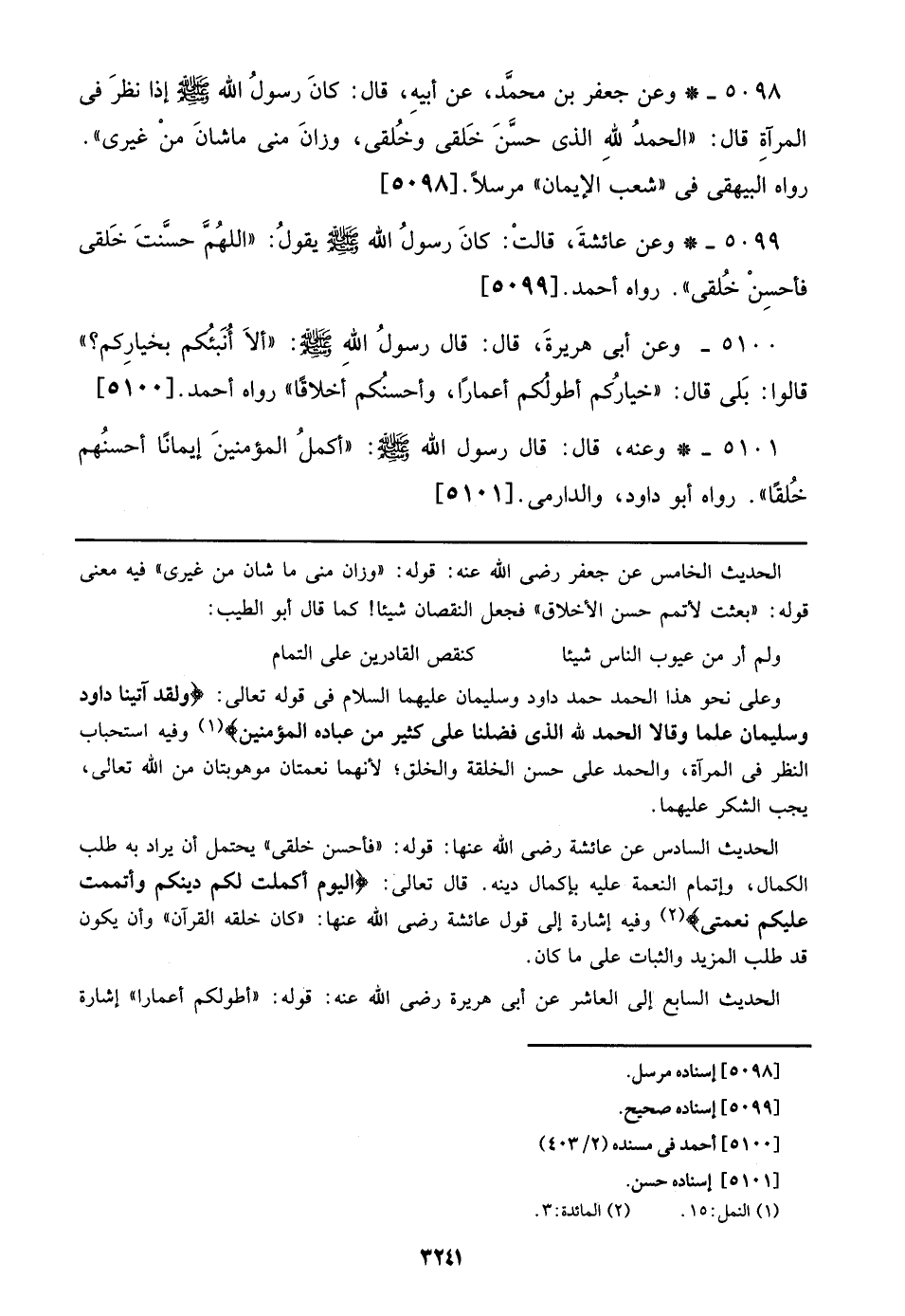 5101 - وعنه، قال: قال رسول الله صلى الله عليه وسلم: ((أكمل المؤمنين إيماناً أحسنهم خلقاً)). رواه أبو داود، والدارمي. [5101]