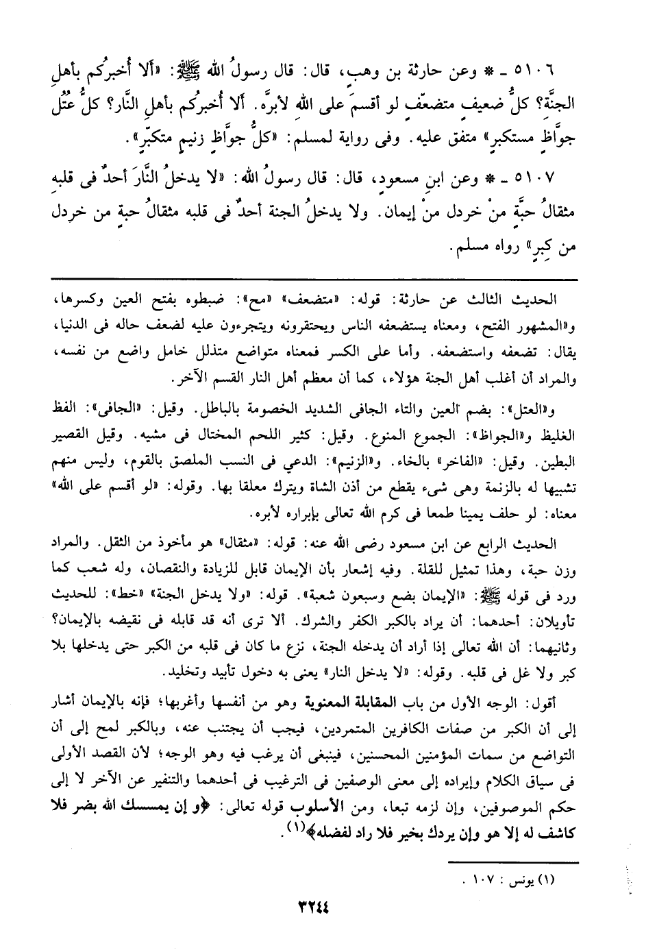 5107 - وعن ابن مسعود، قال: قال رسول الله: ((لا يدخل النار أحد في قلبه مثقال حبة من خردل من إيمان. ولا يدخل الجنة أحد في قلبه مثقال حبة من خردل من كبر)) رواه مسلم.