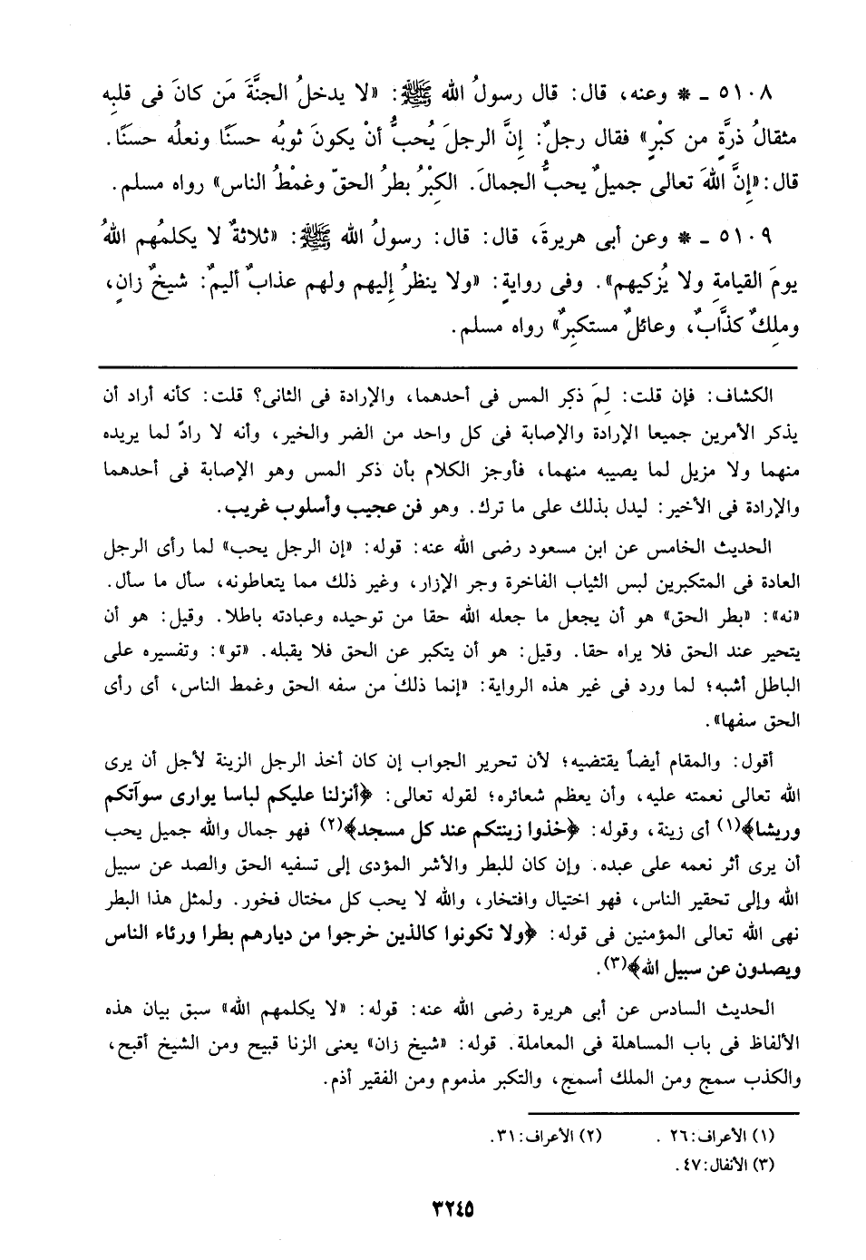 أقول: والمقام أيضاً يقتضيه؛ لأن تحرير الجواب إن كان أخذ الرجل الزينة لأجل أن يرى الله تعالى نعمته عليه، وأن يعظم شعائره؛ لقوله تعالى: {أنزلنا عليكم لباساً يواري سوآتكم وريشا} أي زينة، وقوله: {خذوا زينتكم عند كل مسجد} فهو جمال والله جميل يحب أن يرى أثر نعمه على عبده. وإن كان للبطر والأشر المؤدي إلى تسفيه الحق والصد عن سبيل الله وإلى تحقير الناس، فهو اختيال وافتخار، والله لا يحب كل مختال فخور. ولمثل هذا البطر نهى الله تعالى المؤمنين في قوله: {ولا تكونوا كالذين خرجوا من ديارهم بطرا ورئاء الناس ويصدون عن سبيل الله}.