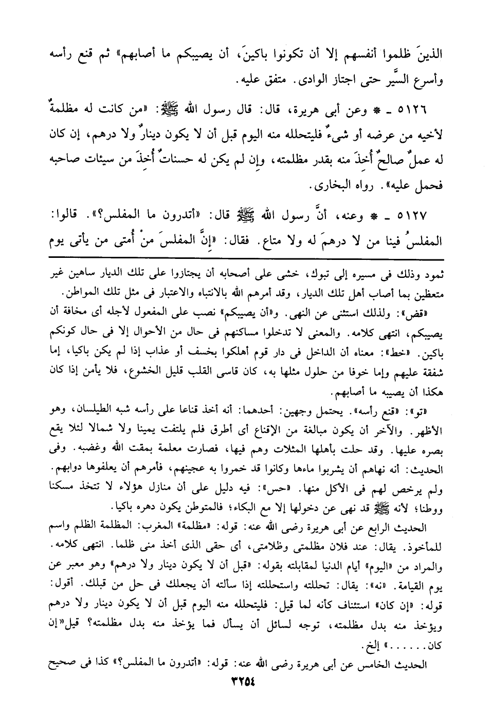 الذين ظلموا أنفسهم إلا أن تكونوا باكين، أن يصيبكم ما أصابهم)) ثم قنع رأسه وأسرع السير حتى اجتاز الوادي. متفق عليه.