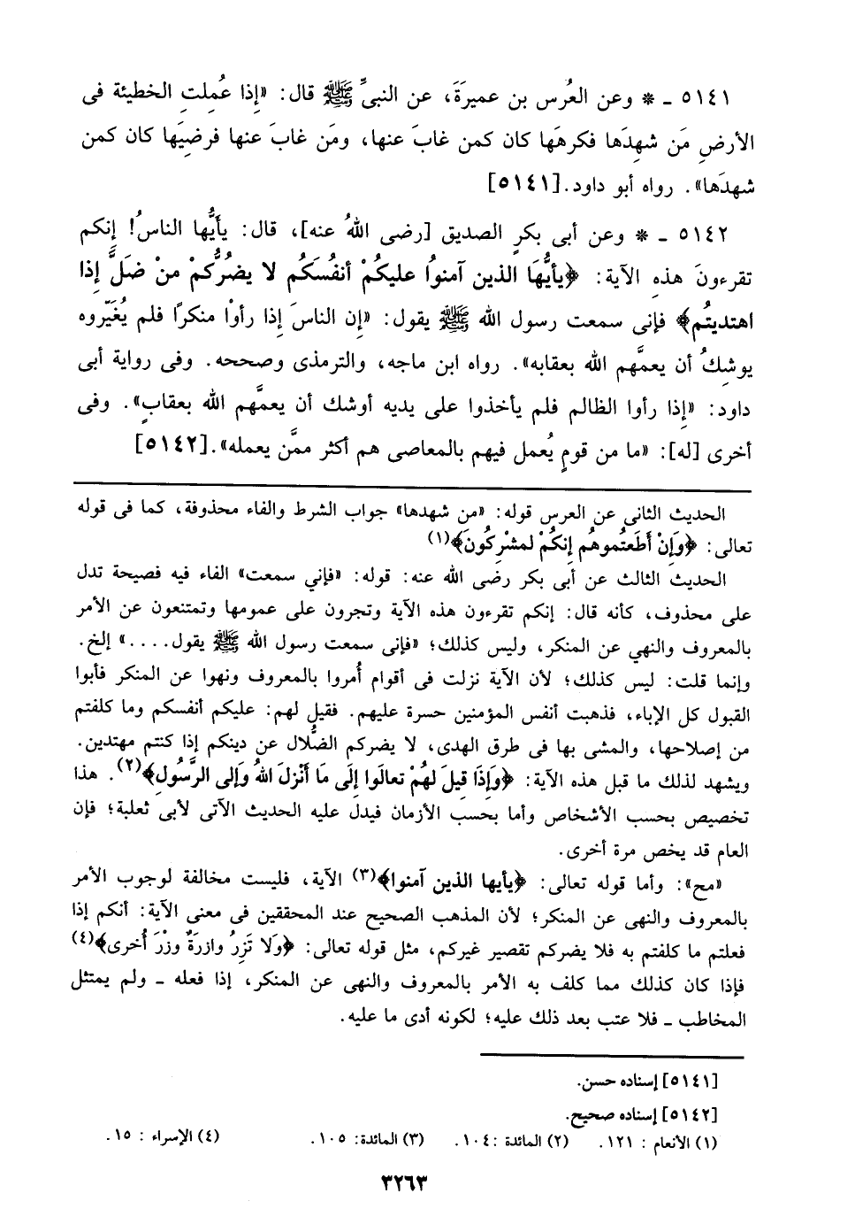 5142 - وعن أبي بكر الصديق [رضي الله عنه]، قال: يا أيها الناس! إنكم تقرءون هذه الآية: ((يا أيها الذين آمنوا عليكم أنفسكم لا يضركم من ضل إذا اهتديتم} فإني سمعت رسول الله صلى الله عليه وسلم يقول: ((إن الناس إذا رأوا منكراً فلم يغيروه يوشك أن يعمهم الله بعقابه)). رواه ابن ماجه، والترمذي وصححه. وفي رواية أبي داود: ((إذا رأوا الظالم فلم يأخذوا على يديه أوشك أن يعمهم الله بعقاب)). وفي أخرى [له]: ((ما من قوم يعمل فيهم بالمعاصي هم أكثر ممن يعمله)). [5142]
