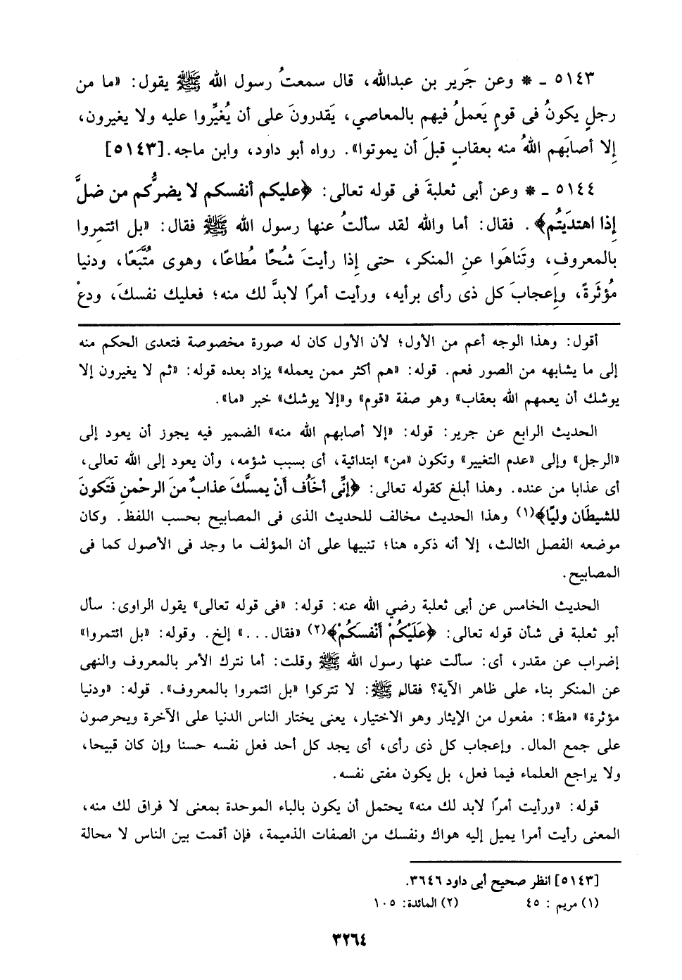 الحديث الخامس عن أبي ثعلبة رضي الله عنه: قوله: ((في قوله تعالى)) يقول الراوي: سأل أبو ثعلبة في شأن قوله تعالى: {عليكم أنفسكم} ((فقال ...)) الخ. وقوله: ((بل ائتمروا)) إضراب عن مقدر، أي: سألت عنها رسول الله صلى الله عليه وسلم وقلت: أما نترك الأمر بالمعروف والنهي عن المنكر بناء على ظاهر الآية؟ فقال صلى الله عليه وسلم: لا تتركوا ((بل ائتمروا بالمعروف)). قوله: ((ودنيا مؤثرة)) ((مظ)): مفعول من الإيثار وهو الاختيار، يعني يختار الناس الدنيا على الآخرة ويحرصون على جمع المال. وإعجاب كل ذي رأي، أي يجد كل أحد فعل نفسه حسنا إن كان قبيحا، ولا يرجع العلماء فيما فعل، بل يكون مفتي نفسه.