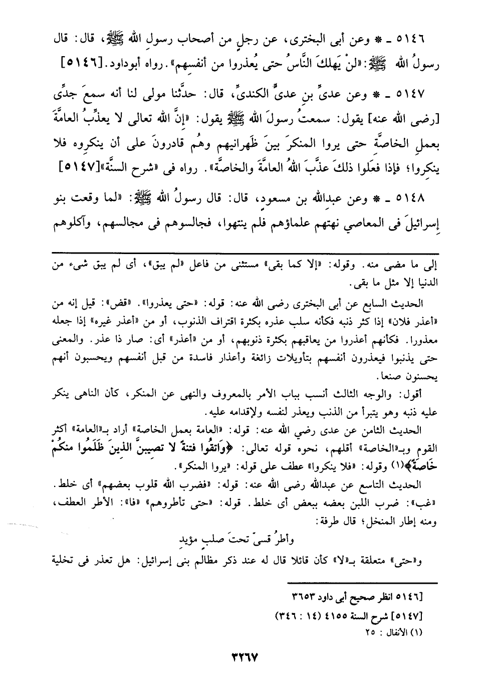الحديث السابع عن أبي البختري رضي الله عنه: قوله: ((حتى يعذروا)). ((قض)): قيل إنه من ((أعذر فلان)) إذا كثر ذنبه فكأنه سلب عذره بكثرة اقتراف الذنوب، أو من ((أعذر غيره)) إذا جعله معذوراً. فكأنهم أعذروا من يعاقبهم بكثرة ذنوبهم، أو من ((أعذر)) أي: صار ذا عذر. والمعنى حتى يذنبوا فيعذرون أنفسهم بتأويلات زائغة وأعذار فاسدة من قبل أنفسهم ويحسبون أنهم يحسنون صنعاً.