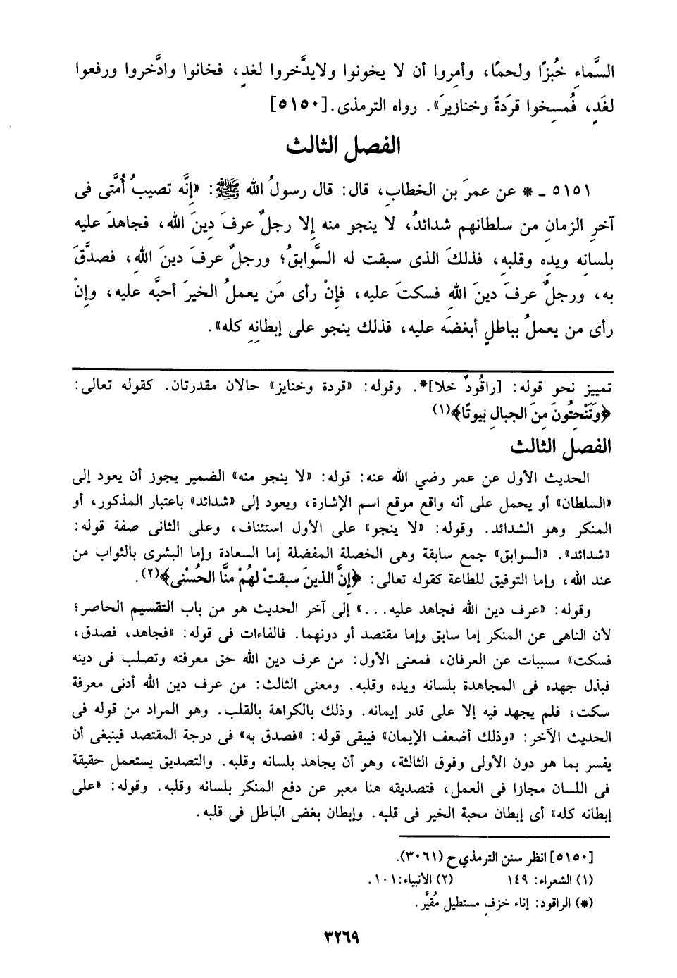 الحديث الأول عن عمر رضي الله عنه: قوله: ((لا ينجو منه)) الضمير يجوز أن يعود إلى ((السلطان)) أو يحمل على أنه واقع موقع اسم الإشارة، ويعود إلى (شدائد)) باعتبار المذكور، أو المنكر وهو الشدائد. وقوله: ((لا ينجو)) على الأول استئناف، وعلى الثاني صفة قوله: ((شدائد)). ((السوابق)) جمع سابقة وهي الخصلة المفضلة إما السعادة وإما البشرى بالثواب من عند الله، وإما التوفيق للطاعة كقوله تعالى: {إن الذين سبقت لهم منا الحسنى}.