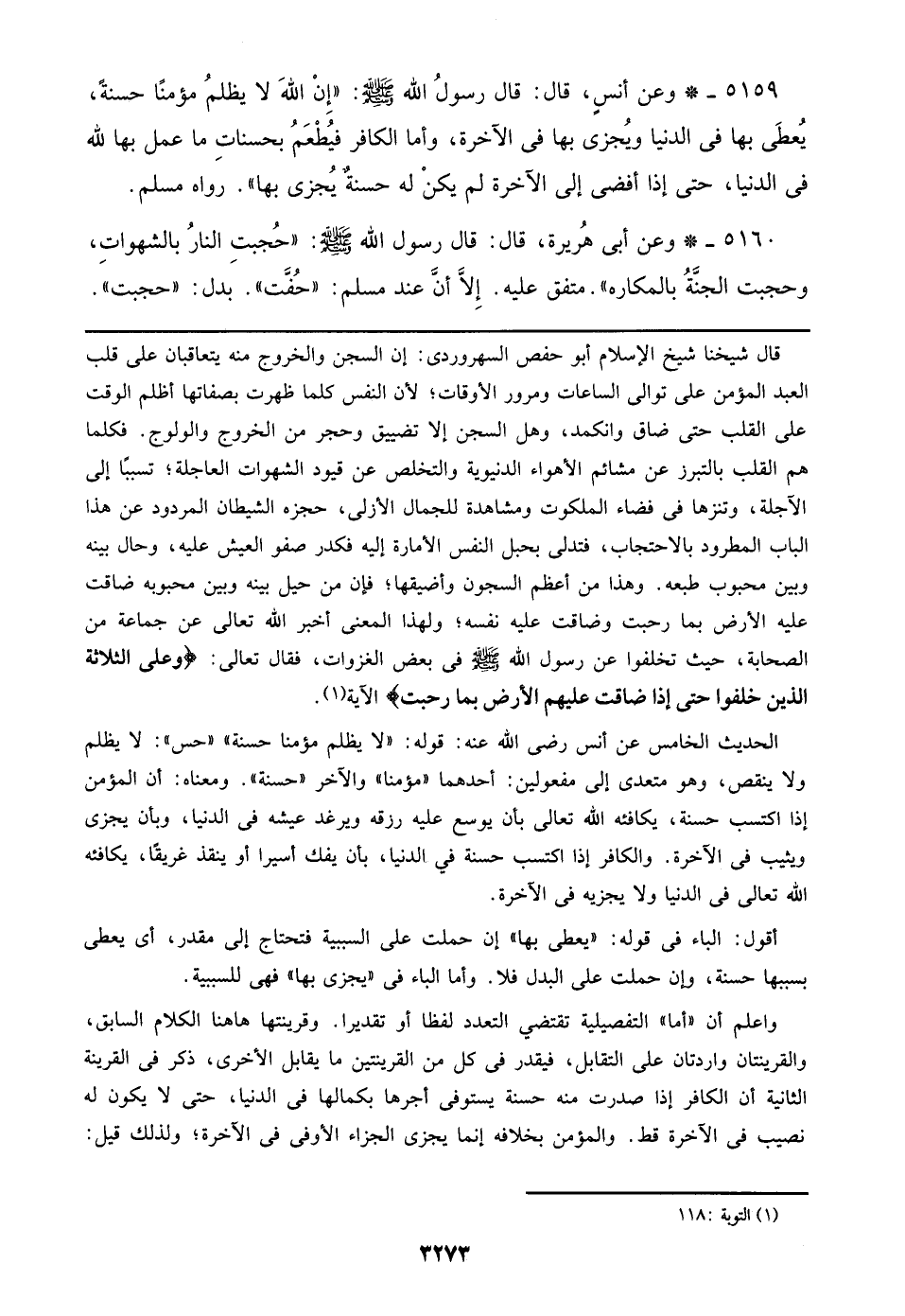 قال شيخنا شيخ الإسلام أبو حفص السهروردي: إن السجن والخروج منه يتعاقبان على قب العبد المؤمن على توالي الساعات ومرور الأوقات؛ لأن النفس كلما ظهرت بصفاتها أظلم الوقت على القلب حتى ضاق وانكمد، وهل السجن إلا تضييق وحجر من الخروج والولوج. فكلما هم القلب بالتبرز عن مشائم الأهواء الدنيوية والتخلص عن قيود الشهوات العاجلة؛ تسببا إلى الآجلة، وتنزها في قضاء الملكوت ومشاهدة للجمالة الأزلي، حجزه الشيطان المردود عن هذا الباب المطرود بالاحتجاب، فتدلى بحبل النفس الأمارة إليه فكدر صفو العيش عليه، وحال بينه وبين محبوب طبعه. وهذا من أعظم السجون وأضيقها؛ فإن من حيل بينه وبين محبوبه ضاقت عليه الأرض بما رحبت وضاقت عليه نفسه؛ ولهذا المعنى أخبر الله تعالى عن جماعة من الصحابة، حيث تخلفوا عن رسول الله صلى الله عليه وسلم في بعض الغزوات، فقال تعالى: {وعلى الثلاثة الذين خلفوا حتى ضاقت عليهم الأرض بم رحبت} الآية.