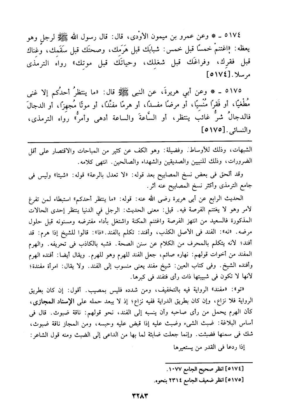 الحديث الرابع عن أبي هريرة رضي الله عنه: قوله: ((ما ينتظر أحدكم)) استبطاء لمن تفرغ لأمر وهو لا يغتنم الفرصة فيه. قيل: معنى الحديث: الرجل في الدنيا ينتظر إحدى الحالات لمذكورة فالسعيد من انتهز الفرصة واغتنم المكنة واستغل بأداء مفترضه ومسنونه قبل حلول مرضه. ((نه)): الفند في الأصل الكذب، وأفند: تكلم بالفند. ((فا)): قالوا للشيخ إذا هرم: قد أفند؛ لأنه يتكلم بالمحرف من الكلام عن سنن الصحة. فشبه بالكاذب في تحريفه. والهرم المفند من أخوات قولهم: نهاره صائم، جعل الفند للهرم وهو للهرم. ويقال أيضاً: أفنده الهرم وأفنده الشيخ. وفي كتاب العين: شيخ مفند يعني منسوب إلى الفند. ولا يقال: امرأة مفندة؛ لأنها لا تكون في شبيبتها ذات رأي فتفند في كبرها.