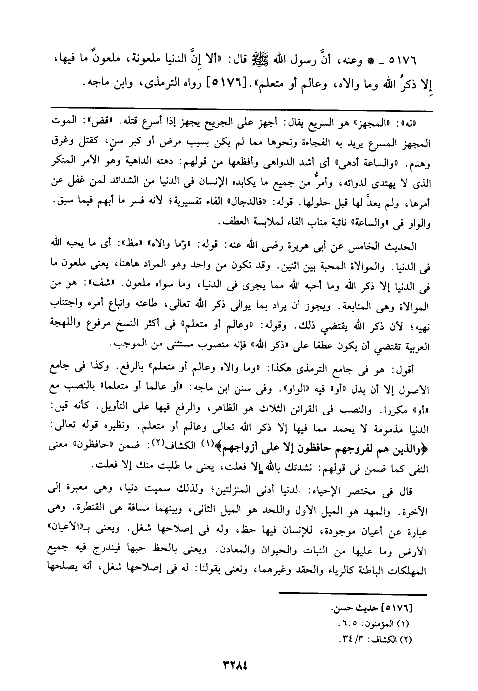 أقول: هو في جامع الترمذي هكذا: ((وما والاه وعالم أو متعلم)) بالرفع. وكذا في جامع الأصول إلا أن بدل ((أو)) فيه ((الواو)). وفي سنن ابن ماجه: ((أو عالما أو متعلما)) بالنصب مع ((أو)) مكررا. والنصب في القرائن الثلاث هو الظاهر، والرفع فيها على التأويل. كأنه قيل: الدنيا مذمومة لا يحمد مما فيها إلا ذكر الله تعالى وعالم أو متعلم. ونظيره قوله تعالى: {والذين هم لفروجهم حافظون إلا على أزواجهم} الكشاف: ضمن ((حافظون)) معنى النفي كما ضمن في فعلت، يعني ما طلبت منك إلا فعلت.
