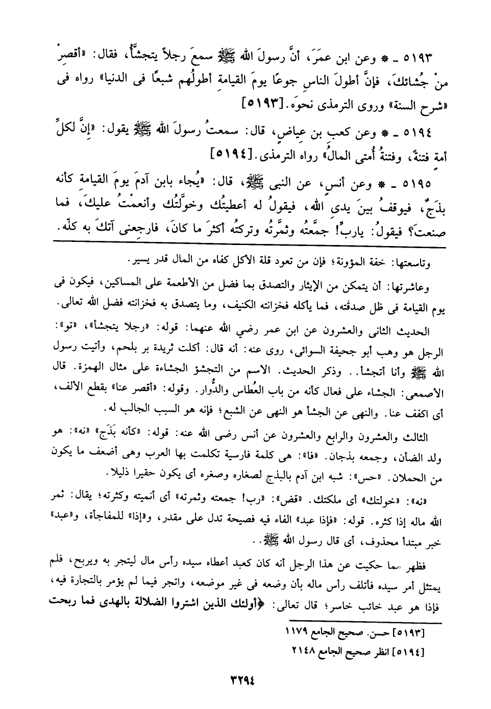 5195 - وعن أنس، عن النبي صلى الله عليه وسلم، قال: ((يجاء بابن آدم يوم القيامة كأنه بذج، فيوقف بين يدي الله، فيقول له أعطيتك وخولتك وأنعمت عليك، فما صنعت؟ فيقول: يا رب! جمعته وثمرته وتركته أكثر ما كان، فارجعني آتك به كله.
