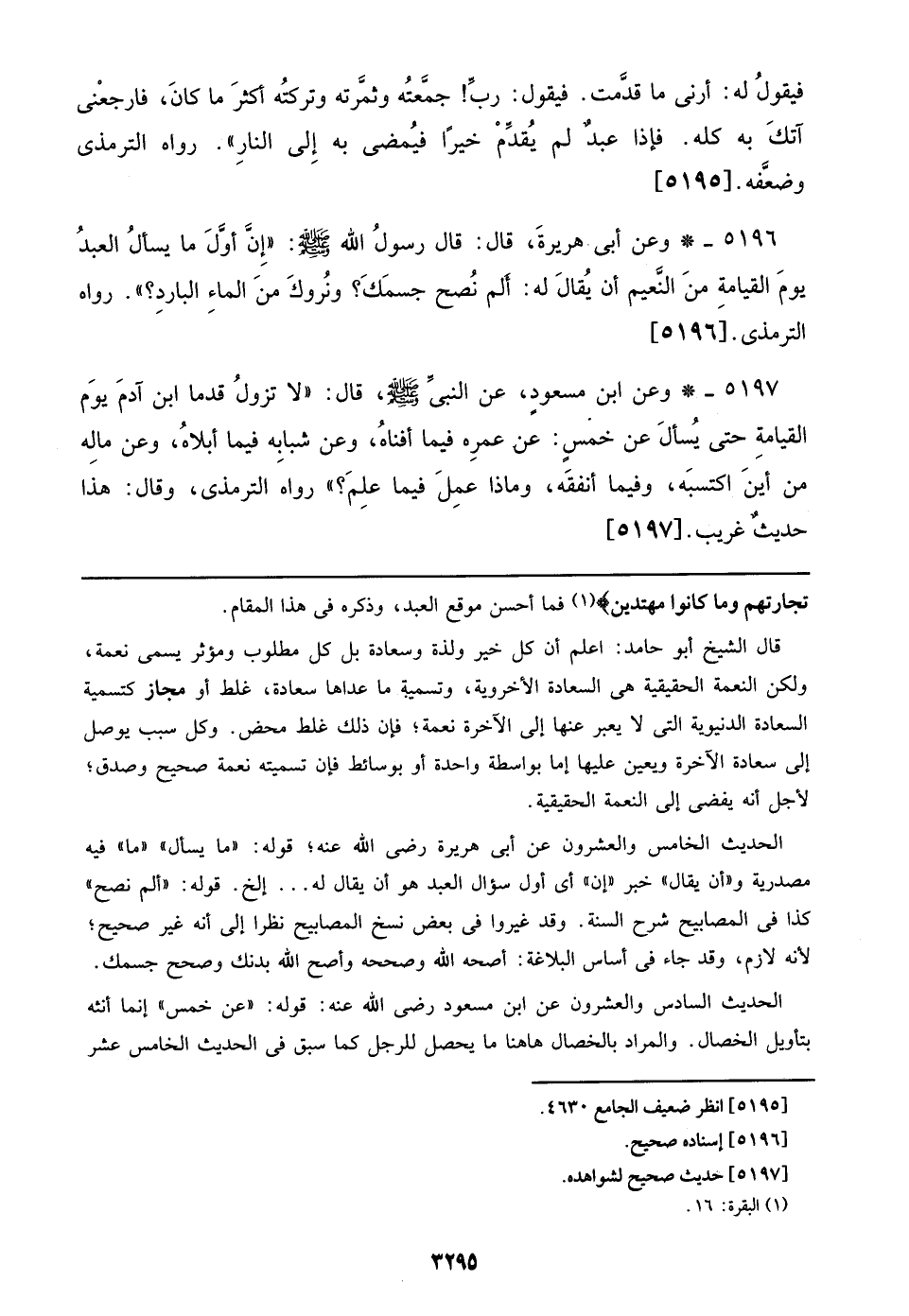 5196 - وعن أبي هريرة، قال: قال رسول الله صلى الله عليه وسلم: ((إن أول ما يسأل العبد يوم القيامة من النعيم أن يقال له: ألم نصح جسمك؟ ونروك من الماء البارد؟)). رواه الترمذي. [5196]