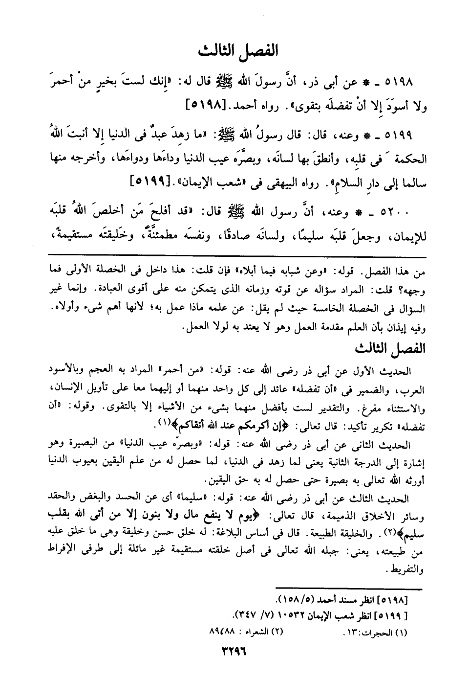 الحديث الأول عن أبي ذر رضي الله عنه: قوله: ((من أحمر)) المراد به العجم وبالأسود العرب، والضمير في ((أن تفضله)) عائد إلى كل واحد منهما أو إليهما معا على تأويل الإنسان، والاستثناء مفرغ. والتقدير لست بأفضل منهما بشيء من الأشياء إلا بالتقوى. وقوله: ((أن تفضله)) تكرير تأكيد: قال تعالى: {إن أكرمكم عند الله أتقاكم}.