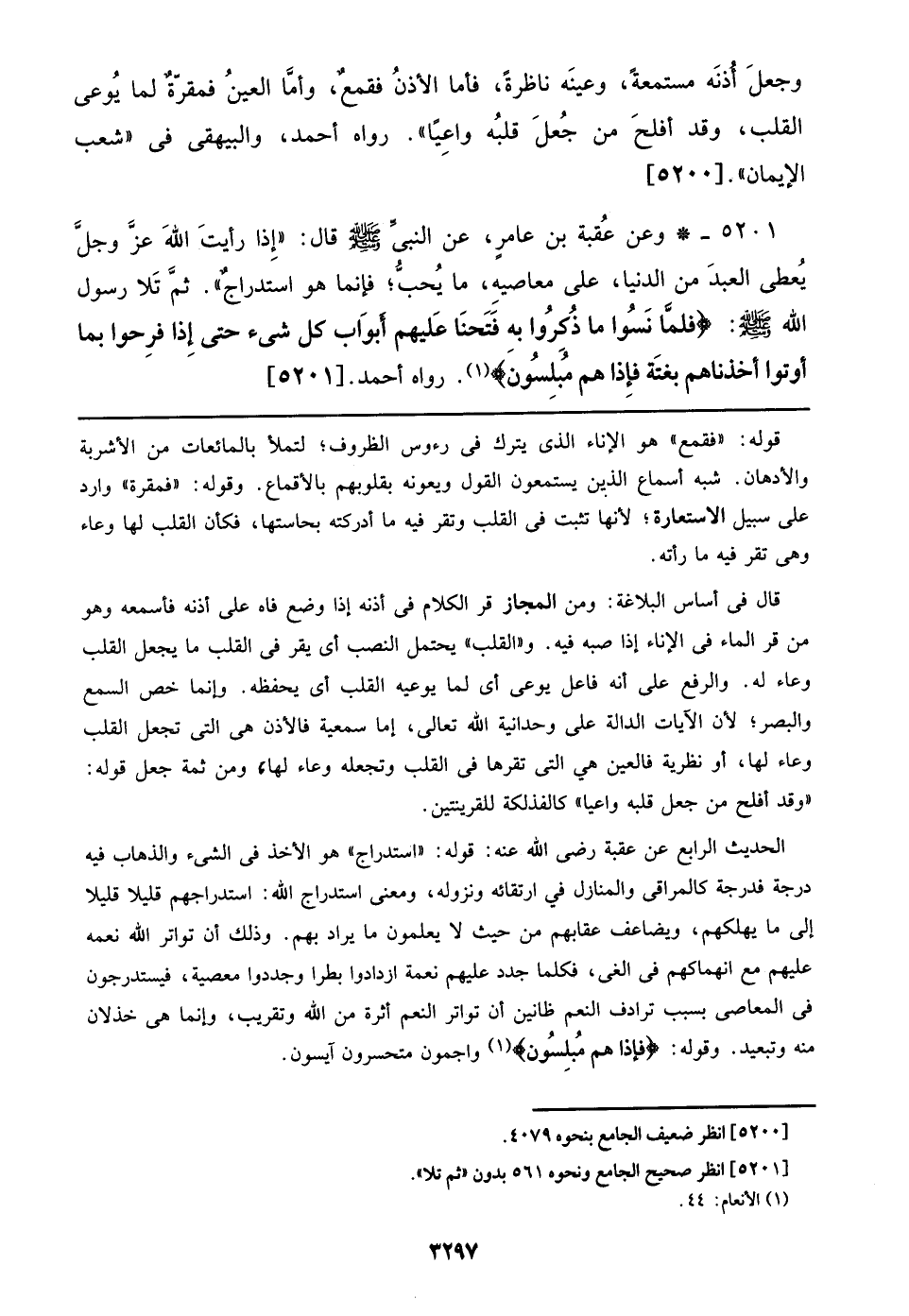 الحديث الرابع عن عقبة رضي الله عنه: قوله: ((استدراج)) هو الأخذ في الشيء والذهاب فيه درجة فدرجة كالمراقي والمنازل في ارتقائه ونزوله، ومعنى استدراج الله: استدراجهم قليلاً قليلاً إلى ما يهلكهم، ويضاعف عقابهم من حيث لا يعلمون ما يراد به. وذلك أن تواتر الله نعمة عليهم مع انهماكهم في الغي، فكلما جدد عليهم نعمة ازدادوا بطرا وجددوا معصية، فيستدرجون في المعاصي بسبب ترادف النعم ظانين أن تواتر النعم أثرة من الله وتقريب، وإنما هي خذلان منه وتبعيد. وقوله: {فإذا هم مبلسون} واجمون متحسرون آيسون.