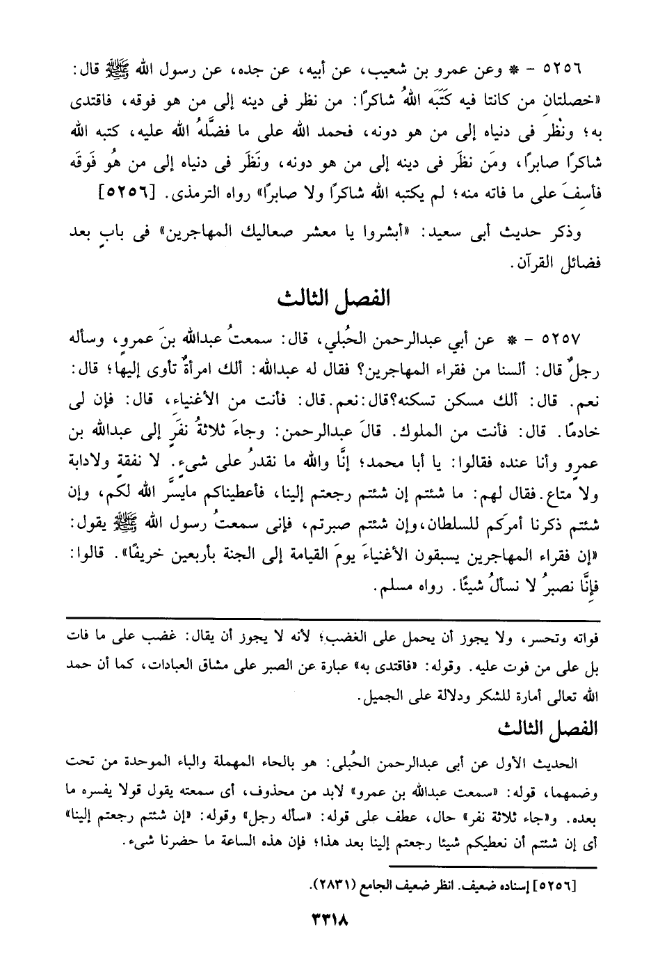 5257 - عن أي عبد الرحمن الحبلي، قال: سمعت عبد الله بن عمرو، وسأله رجل قال: ألسنا من فقراء المهاجرين؟ فقال له عبد الله: ألك امرأة تأوي إليها؛ قال: نعم. قال: ألك مسكن تسكنه؟ قال: نعم. قال: فأنت من الأغنياء، قال: فإن لي خادما. قال: فأنت من الملوك. قال عبد الرحمن: وجاء ثلاثة نفر إلى عبد الله بن عمرو وأنا عنده فقالوا: يا أبا محمد؛ إنا والله ما نقدر على شيء. لا نفقة ولا دابة ولا متاع. فقال لهم: ما شئتم إن شئتم رجعتم إلينا، فأعطيناكم ما يسر الله لكم، وإن شئتم ذكرنا أمركم للسلطان، وإن شئتم صبرتم، فإني سمعت رسول الله صلى الله عليه وسلم يقول: ((إن فقراء المهاجرين يسبقون الأغنياء يوم القيامة إلى الجنة بأربعين خريفا)). قالوا: فإنا نصبر لا نسأل شيئا. رواه مسلم.