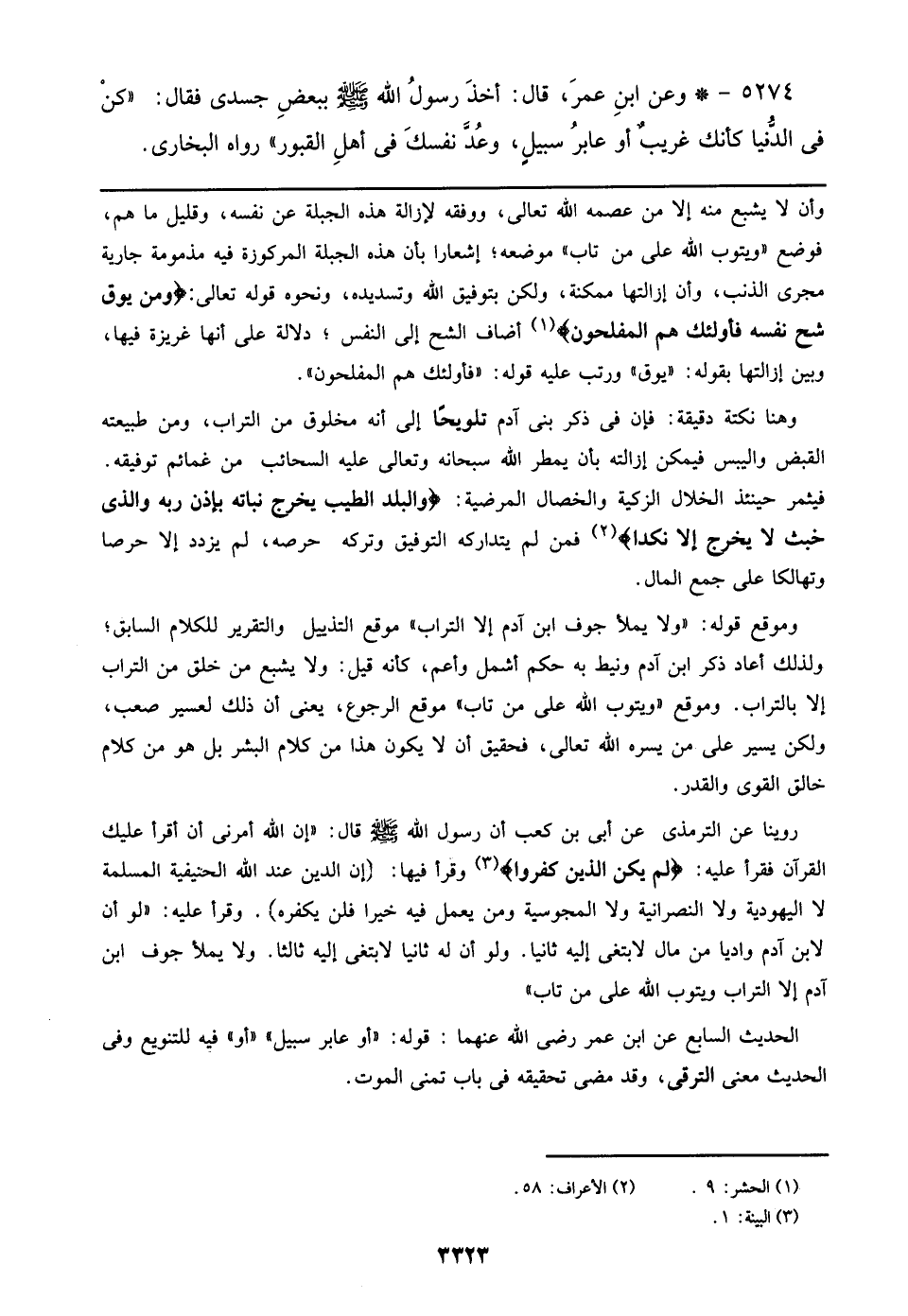 5274 - وعن ابن عمر، قال: أخذ رسول الله صلى الله عليه وسلم ببعض جسدي فقال: ((كن في الدنيا كأنك غريب أو عابر سبيل، وعد نفسك في أهل القبور)) رواه البخاري.