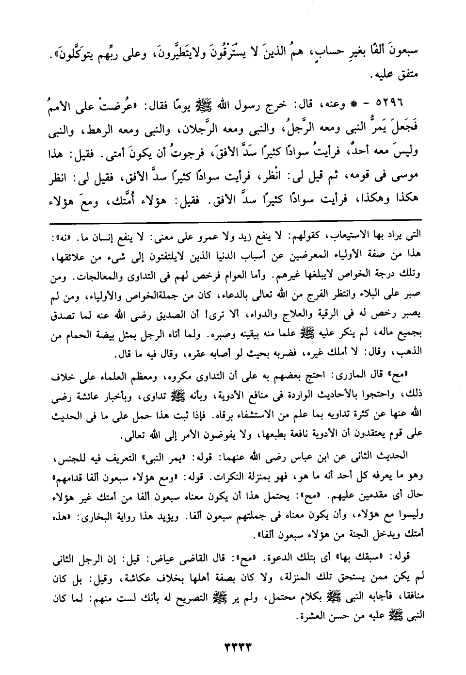 الحديث الثاني عن ابن عباس رضي الله عنهما: قوله: ((يمر النبي)) التعريف فيه للجنس، وهو ما يعرفه كل أحد أنه ما هو، فهو بمنزلة النكرات. قوله: ومع هؤلاء سبعون ألفا قدامهم)) حال أي مقدمين عليهم. ((مح)): يحتمل هذا أن يكون معناه سبعون ألفا من أمتك غير هؤلاء وليسوا مع هؤلاء. وأن يكون معناه في جملتهم سبعون ألفا. ويؤيد هذا رواية البخاري: ((هذه أمتك ويدخل الجنة من هؤلاء سبعون ألفا)).