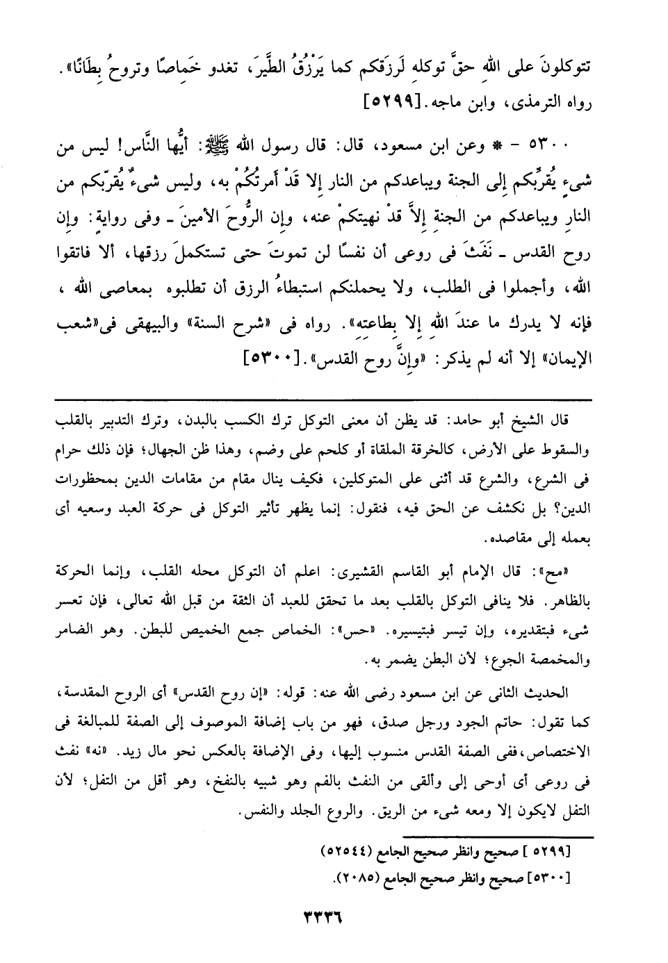 5300 - وعن ابن مسعود، قال: قال رسول الله صلى الله عليه وسلم: ((أيها الناس! ليس منكم شيء يقربكم إلى الجنة ويباعدكم من النار إلا قد أمرتكم به، وليس شيء يقربكم من النار ويباعدكم من الجنة إلا قد نهيتكم عنه، وإن الروح الأمين – وفي رواية: وإن روح القدس – نفث في روعي أن نفسا لن تموت حتى تستكمل رزقها، ألا فاتقوا الله، وأجملوا في الطلب، ولا يحملنكم استبطاء الرزق أن تطلبوه بمعاصي الله، فإنه لا يدرك ما عند الله إلا بطاعته)). رواه في ((شرح السنة)) والبيهقي في ((شعب الإيمان)) إلا أنه لم يذكر: ((وإن روح القدس)). [5300]