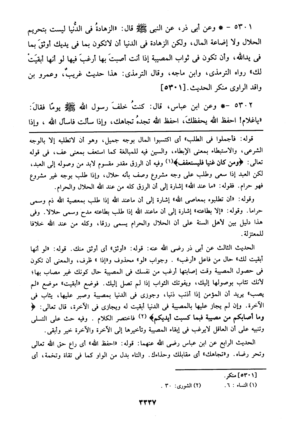 5302 - وعن ابن عباس، قال: كنت خلف رسول الله صلى الله عليه وسلم يوما فقال: ((يا غلام! احفظ الله يحفظك، احفظ الله تجده تجاهك، وإذا سألت فاسأل الله، وإذا