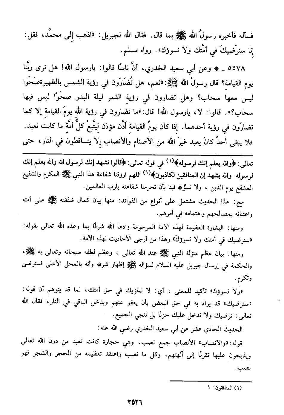5578 - وعن أبي سعيد الخدري، أن ناساً قالوا: يا رسول الله! هل نرى ربنا يوم القيامة؟ قال رسول الله صلى الله عليه وسلم: ((نعم، هل تضارون في رؤية الشمس بالظهيرة صحواً ليس معها سحاب؟ وهل تضارون في رؤية القمر ليلة البدر صحواً ليس فيها سحاب؟)) قالوا: لا، يا رسول الله! قال: ((ما تضارون في رؤية الله يوم القيامة إلا كما تضارون في رؤية أحدهما. إذا كان يوم القيامة أذن مؤذن ليتبع كل أمة ما كانت تعبد.