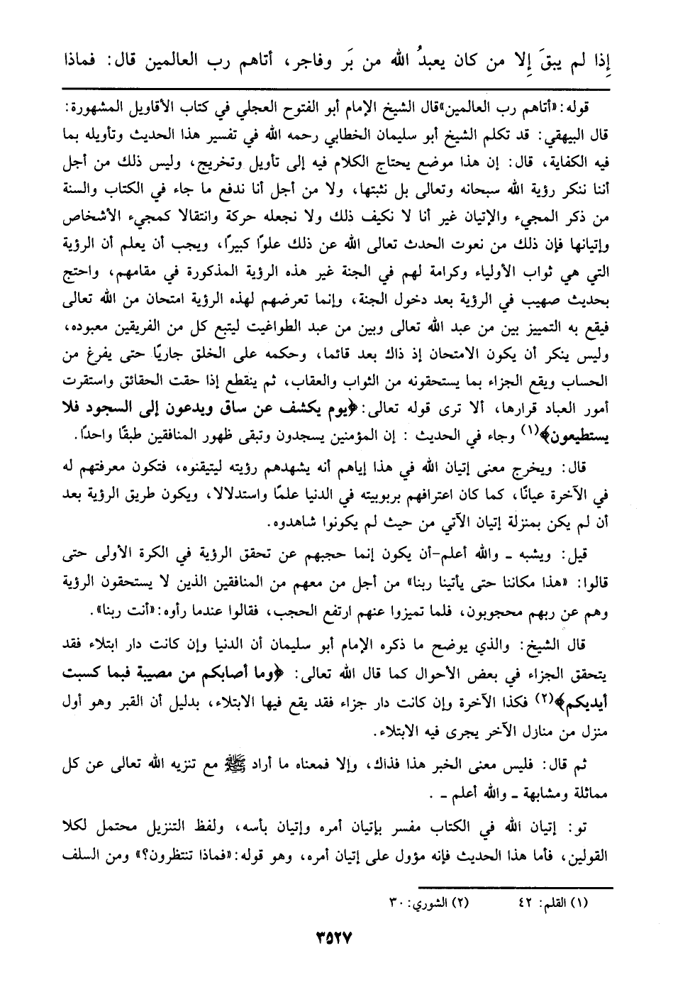 قوله: ((أتاهم رب العالمين)) قال الشيخ الإمام أبو الفتوح العجلي في كتاب الأقاويل المشهورة: قال البيهقي: قد تكلم الشيخ أبو سليمان الخطابي رحمه الله في تفسر هذا الحديث وتأويله بما فيه الكفاية، قال: إن هذا موضع يحتاج الكلام فيه إلى تأويل وتخريج، وليس ذلك من أجل أننا ننكر رؤية الله سبحانه وتعالى بل نثبتها، ولا من أجل أنا ندفع ما جاء في الكتاب والسنة من ذكر المجيء والإتيان غير أنا لا نكيف ذلك ولا نجعله حركة وانتقالاً كمجيء الأشخاص وإتيانهما فإن ذلك من نعوت الحدث تعالى الله عن ذلك علواً كبيراً، ويجب أن يعلم أن الرؤية التي هي ثواب الأولياء وكرامة لهم في الجنة غير هذه الرؤية المذكورة في مقامهم، واحتج بحديث صهيب في الرؤية بعد دخول الجنة، وإنما تعرضهم لهذه الرؤية امتحان من الله تعالى فيقع به التمييز بين من عبد الله تعالى وبين من عبد الطواغيت ليتبع كل من الفريقين معبوده، وليس ينكر أن يكون الامتحان إذ ذاك بعد قائماً، وحكمه على الخلق جارياً حتى يفرغ من الحساب ويقع الجزاء بما يستحقونه من الثواب والعقاب، ثم ينقطع إذا حقت الحقائق واستقرت أمور العباد قرارها، ألا ترى قوله تعالى: {يوم يكشف عن ساق ويدعون إلى السجود فلا يستطيعون} وجاء في الحديث: إن المؤمنين يسجدون وتبقى ظهور المنافقين طبقاً واحداً.