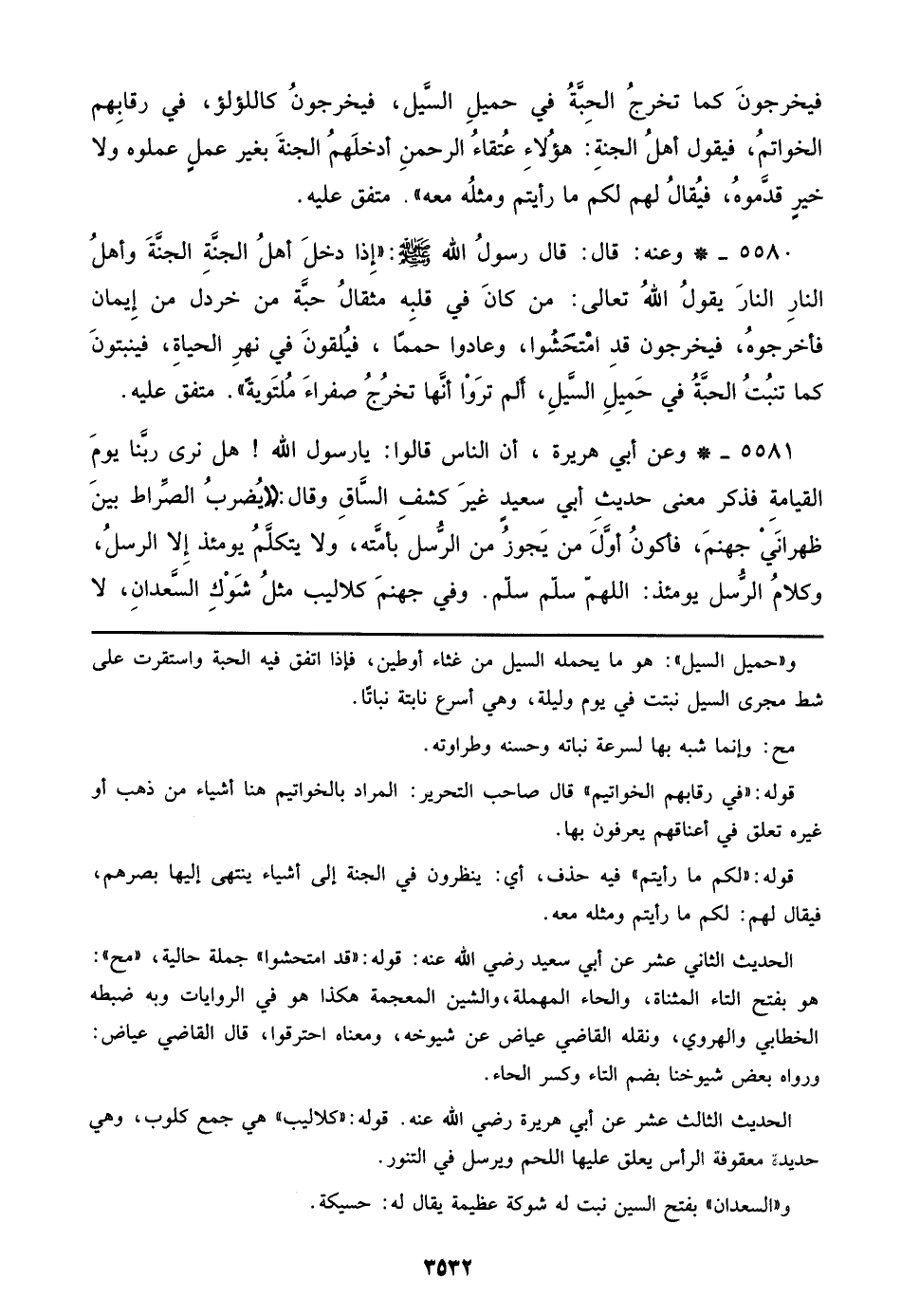 5580 - وعنه قال: قال رسول الله صلى الله عليه وسلم: ((إذا دخل أهل الجنة الجنة وأهل النار النار يقول الله تعالى: من كان في قلبه مثقال حبة من خردل من إيمان فأخرجوه، فيخرجون قد امتحشوا، وعادوا حمماً، فيلقون في نهر الحياة، فينبتون كما تنبت الحبة في حميل السيل، ألم تروا أنها تخرج صفراء ملتوية)). متفق عليه.