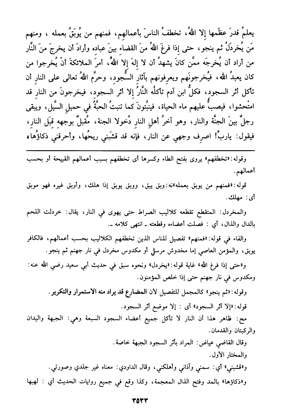 يعلم قدر عظمها إلا الله، تخطف الناس بأعمالهم، فمنهم من يوبق بعمله، ومنهم من يخردل ثم ينجو، حتى إذا فرغ الله من القضاء بين عباده وأراد أن يخرج من النار من أراد أن يخرجه ممن كان يشهد أن لا إله إلا الله، أمر الملائكة أن يخرجوا من كان يعبد الله، فيخرجونهم ويعرفونهم بآثار السجود، وحرم الله تعالى على النار أن تأكل أثر السجود، فكل ابن آدم تأكله النار إلا أثر السجود، فيخرجون من النار قد امتحشوا، فيصب عليهم ماء الحياة، فينبتون كما تنبت الحبة في حميل السيل، ويبقى رجل بين الجنة والنار، وهو آخر أهل النار دخولاً الجنة، مقبل بوجهه قبل النار، فيقول: يا رب! اصرف وجهي عن النار، فإنه قد قشبني ريحها، وأحرقني ذكاؤها،