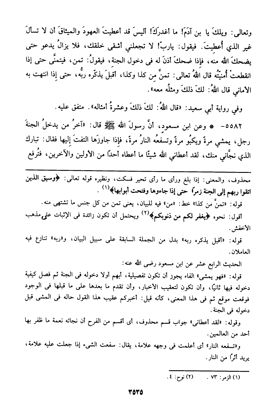 5582 - وعن ابن مسعود، أن رسول الله صلى الله عليه وسلم قال: ((آخر من يدخل الجنة رجل، يمشي مرة ويكبو مرة وتسفعه النار مرة، فإذا جاؤوها التفت إليها فقال: تبارك الذي نجاني منك، لقد أعطاني الله شيئاً ما أعطاه أحداً من الأولين والآخرين فترفع