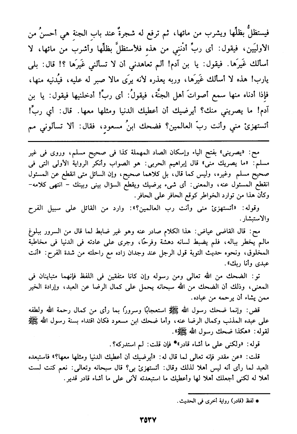 قلت: ((عن مقدر فإنه تعالى لما قال له: ((أيرضيك أن أعطيك الدنيا ومثلها معها؟)) فاستبعده العبد لما رأي أنه ليس أهلا لذلك وقال: أتستهزئ بي؟ قال سبحانه وتعالى: نعم كنت لست أهلا له لكني أجعلك أهلا لها وأعطيك ما استبعدته لأني على ما أشاء قادر قدير.