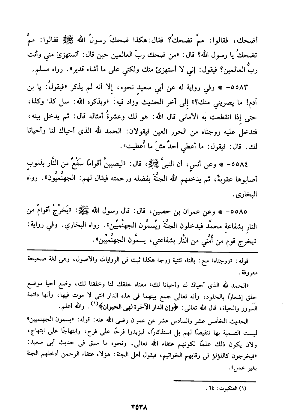 5585 - وعن عمران بن حصين، قال: قال رسول الله صلى الله عليه وسلم: ((يخرجُ أقوامٌ من النار بشفاعة محمد فيدخلون الجنَّة ويُسمَّون الجهنميين)). رواه البخاري. وفي رواية: ((يخرج قوم من أُمَّتي من النَّار بشفاعتي، يسمَّون الجهنميين)).