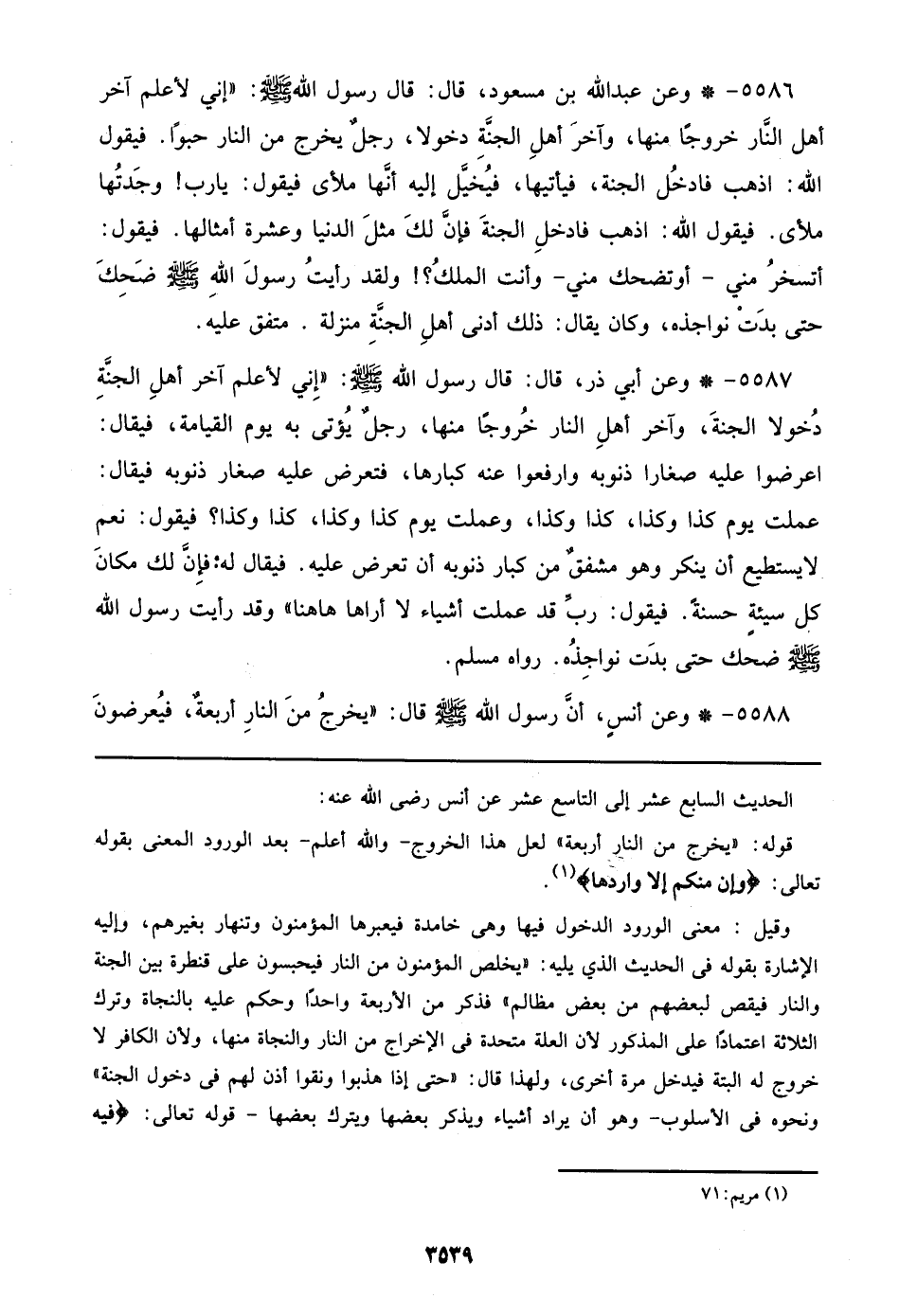 5586 - وعن عبد الله بن مسعود، قال: قال رسول الله صلى الله عليه وسلم: ((إني لأعلم آخر أهل النار خروجًا منها وآخر أهل الجنة دخولا، رجلٌ يخرج من النار حبوًا. فيقول الله: اذهب فادخل الجنة، فيأتيها، فيُخيل إليه أنها ملأي فيقول: يارب! وجدتها ملأي. فيقول الله: اذهب فادخل الجنة فإن لك مثل الدنيا وعشرة أمثالها. فيقول: أتسخر مني - أو تضحك مني - وأنت الملكُ؟! ولقد رأيتُ رسول الله صلى الله عليه وسلم ضَحِكَ حتى بدت نواجذه، وكان يقال: ذلك أدنى أهلِ الجنة منزلة. متفق عليه.