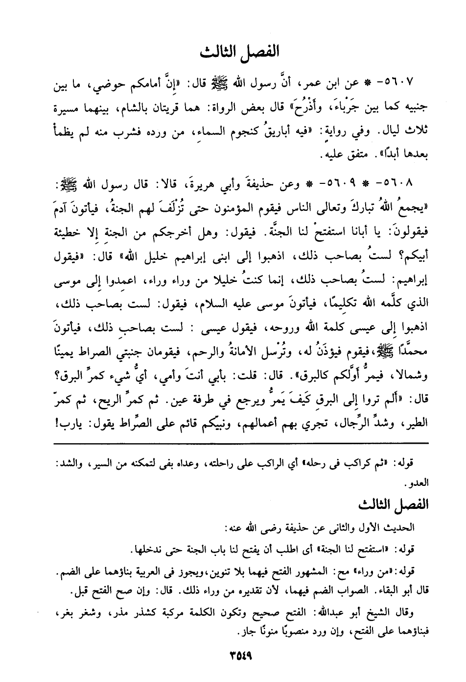 5607 - عن ابن عمر، أنَّ رسول الله صلى الله عليه وسلم قال: ((إنَّ أمامكم حوضي، ما بين جنبيه كما بين جرباء، وأذرح)) قال بعض الرواة: هما قريتان بالشام، بينهما مسيرة ثلاث ليال. وفي رواية: ((فيه أباريق كنجوم السماء، من ورده فشرب منه لم يظمأ بعدها أبدًا)). متفق عليه.