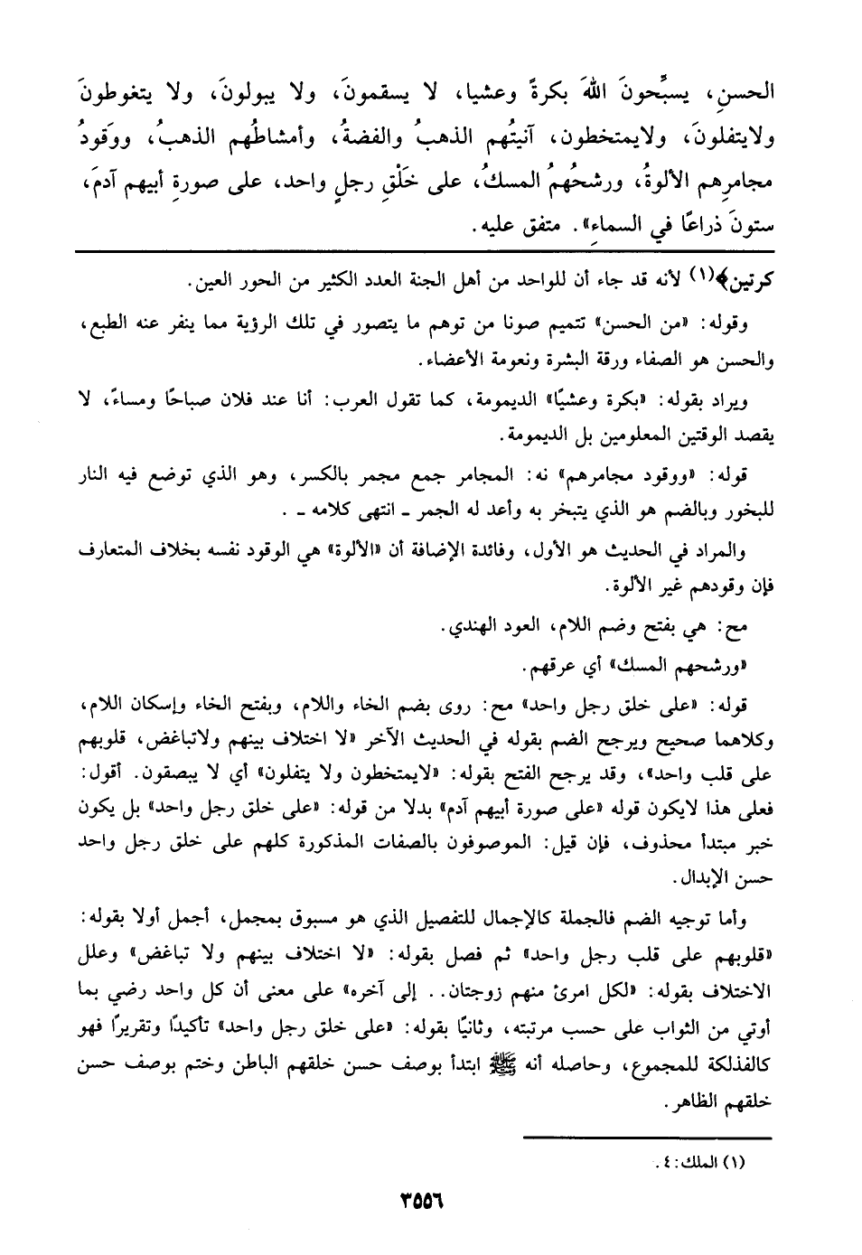 الحسن؟ يسبِّحونَ اللهَ بكرةً وعشيا، لا يسقمونَ، ولا يبولونَ، ولا يتغوطونَ ولا يتفلونَ، ولايمتخطون، آنيتُهم الذهبُ والفضةُ، وأمشاطُهم الذهبُ، ورَقودُ مجامرِهم الألوةُ، ورشحهمُ المسكُ، على خَلقِ رجلٍ واحد، على صورةِ أبيهم آدمَ، ستونَ ذراعًا في السماءِ)). متفق عليه.