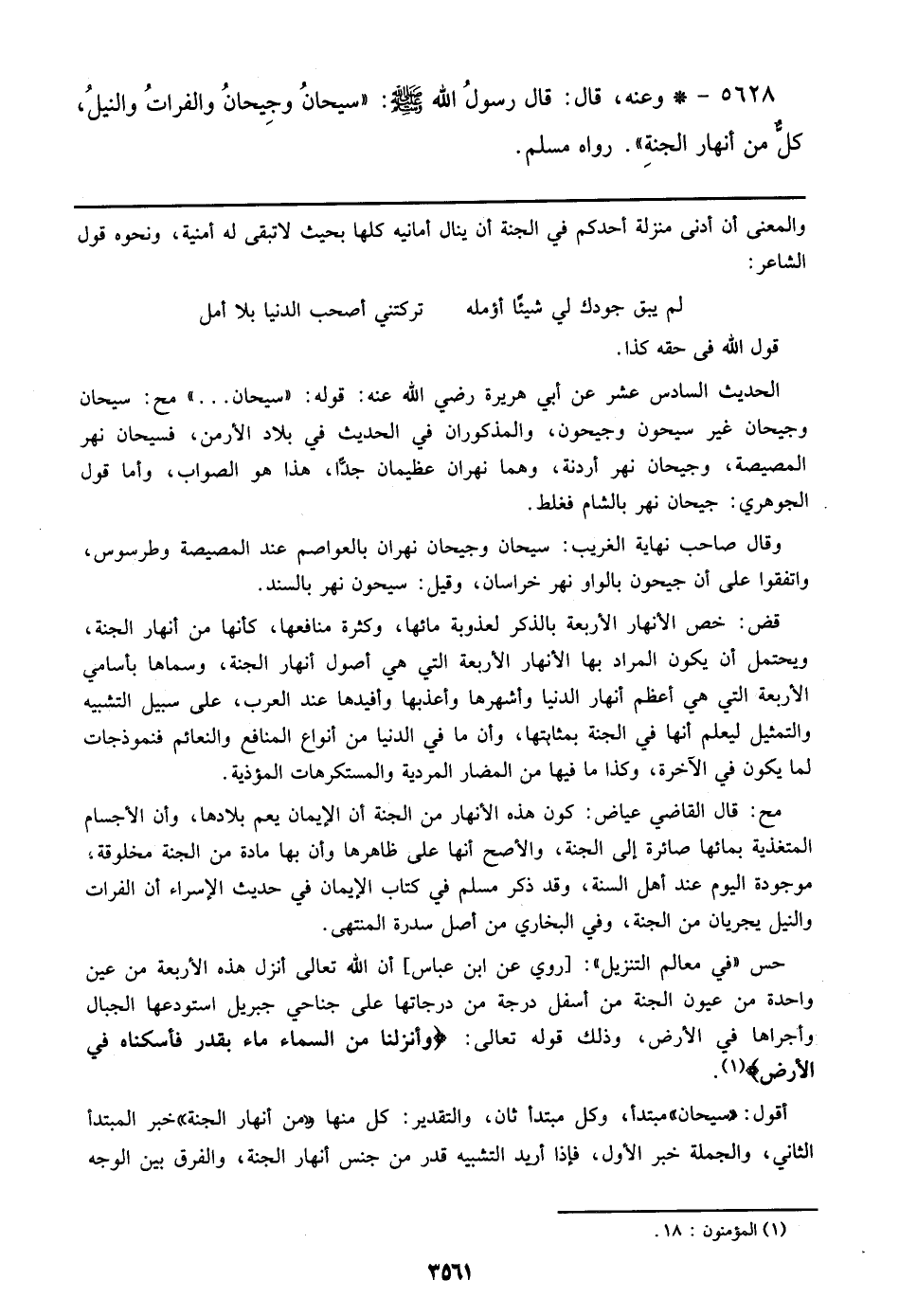 الحديث السادس عشر عن أبي هريرة رضي الله عنه: قوله: ((سيحان ...)) مح: سيحان وجيحان غير سيحون وجيحون، والمذكوران في الحديث في بلاد الآرمن، فسيحان نهر المصيصة، وجيحان نهر أردنة، وهما نهران عظيمان جدًّا، هذا هو الصواب، وأما قول الجوهري: جيحان نهر بالشام فغلط.