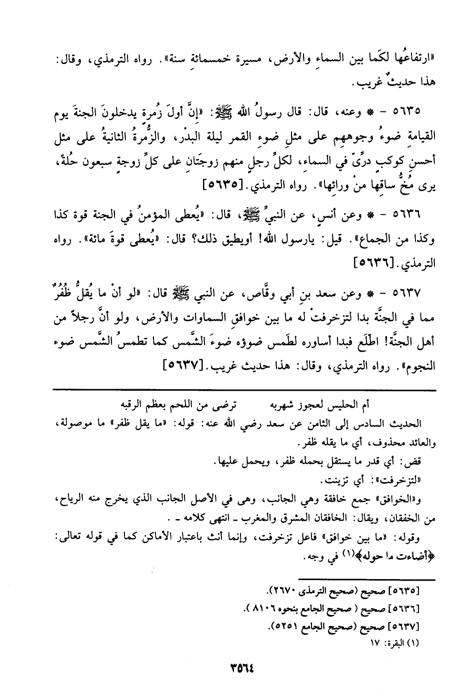 5637 - وعن سعد بنِ أبي وقَّاص، عن النبي صلى الله عليه وسلم قال: ((لو أنْ ما يُقلُّ ظُفُرٌ مما في الجنَّة بدا لتزخرفتْ له ما بين خوافقِ السماوات والأرض، ولو أنَّ رجلاً من أهل الجنَّة! اطّلَع فبدا أساوره لطَمس ضوؤه ضوء الشَّمس كما تطمسُ الشَّمس ضوء النجوم)). رواه الترمذي، وقال: هذا حديث غريب. [5637]