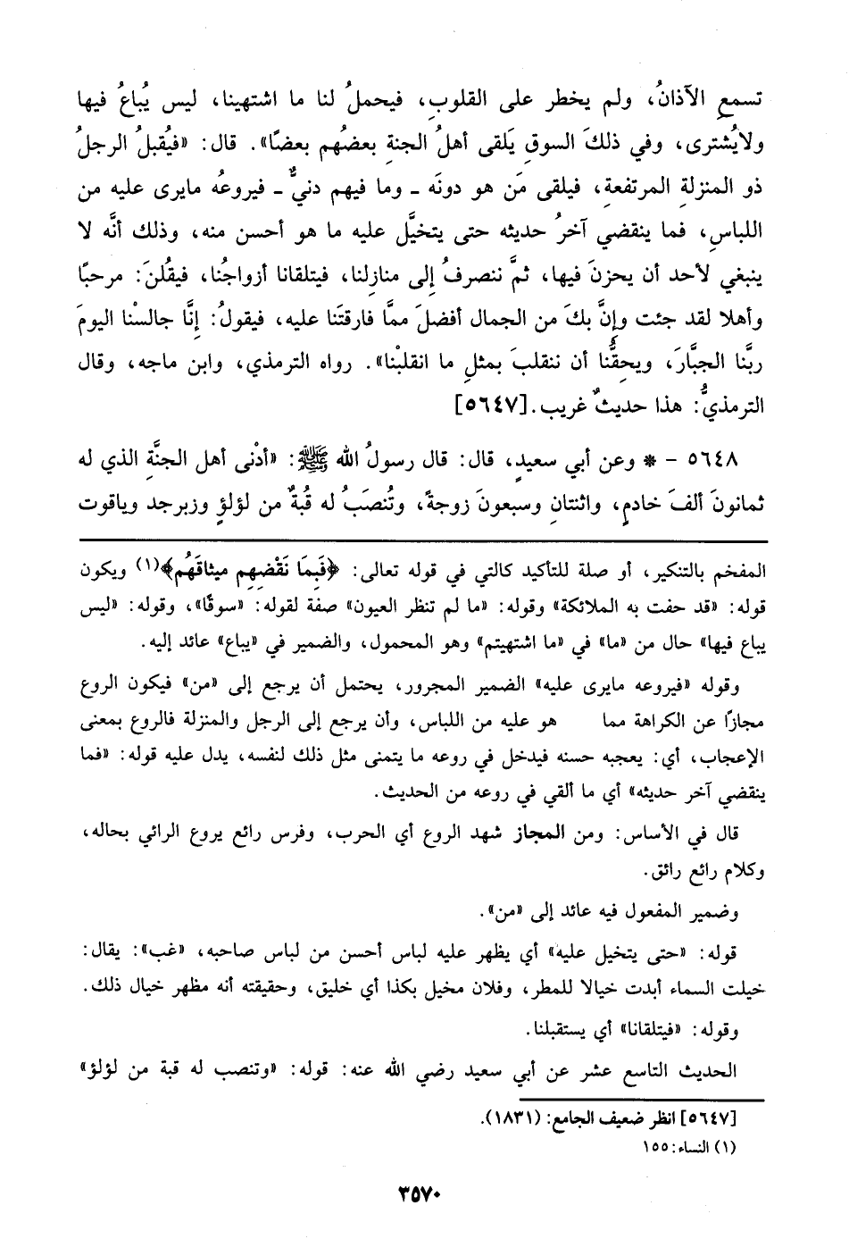 5648 - وعن أبي سعيدٍ، قال: قال رسول الله صلى الله عليه وسلم: ((أدْنى أهل الجنَّةِ الذي له ثمانونَ ألف خادمٍ، واثنتانِ وسبعونَ زوجةً، وتُنصَبُ له قُبةٌ من لؤلؤٍ وزبرجد وياقوت