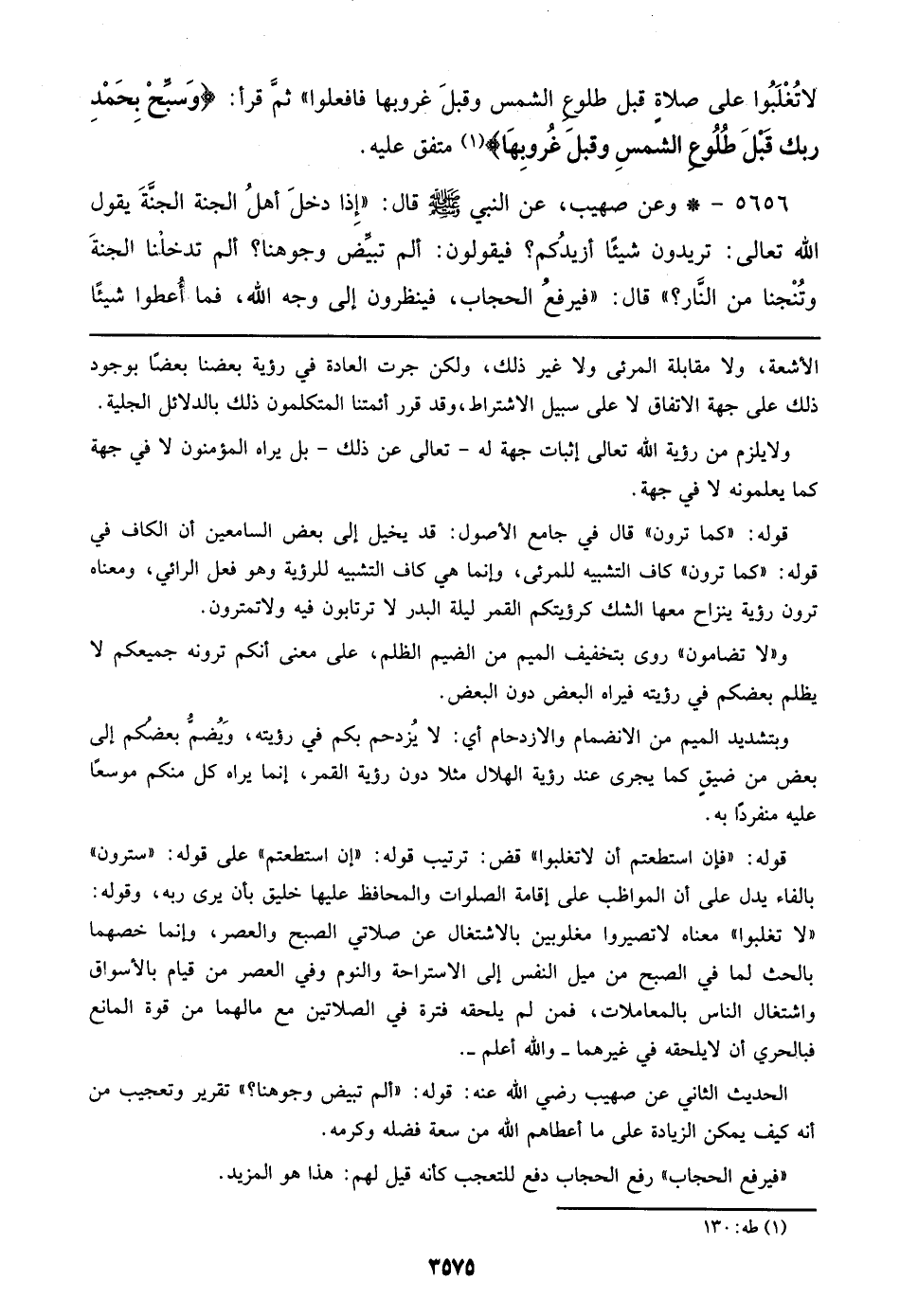 قوله: ((فإن استطعتم أن لاتغلبوا)) قض: ترتيب قوله: ((إن استطعتم)) على قوله: ((سترون)) بالفاء يدل على أن المواظب على إقامة الصلوات والمحافظ عليها خليق بأن يرى ربه، وقوله: ((لا تغلبوا)) معناه لا تصيروا مغلوبين بالاشتغال عن صلاتي الصبح والعصر، وإنما خصهما بالحث لما في الصبح من ميل النفس إلى الاستراحة والنوم وفي العصر من قيام بالأسواق واشتغال الناس بالمعاملات، فمن لم يلحقه فترة في الصلاتين مع مالهما من قوة المانع فبالحري أن لايلحقه في غيرهما - والله أعلم -.