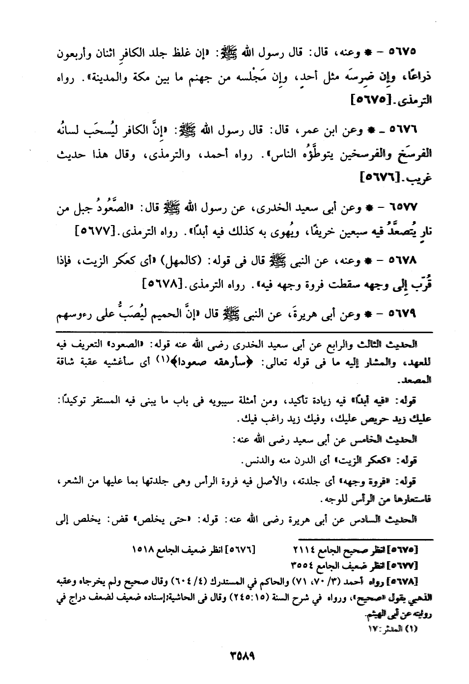 5677 - وعن أبي سعيد الخدري، عن رسول الله صلى الله عليه وسلم قال: ((الصعود جبل من نار يُتصعدُ فيه سبعين خريفًا، ويهوى به كذلك فيه أبدًا)). رواه الترمذي. [5677]
