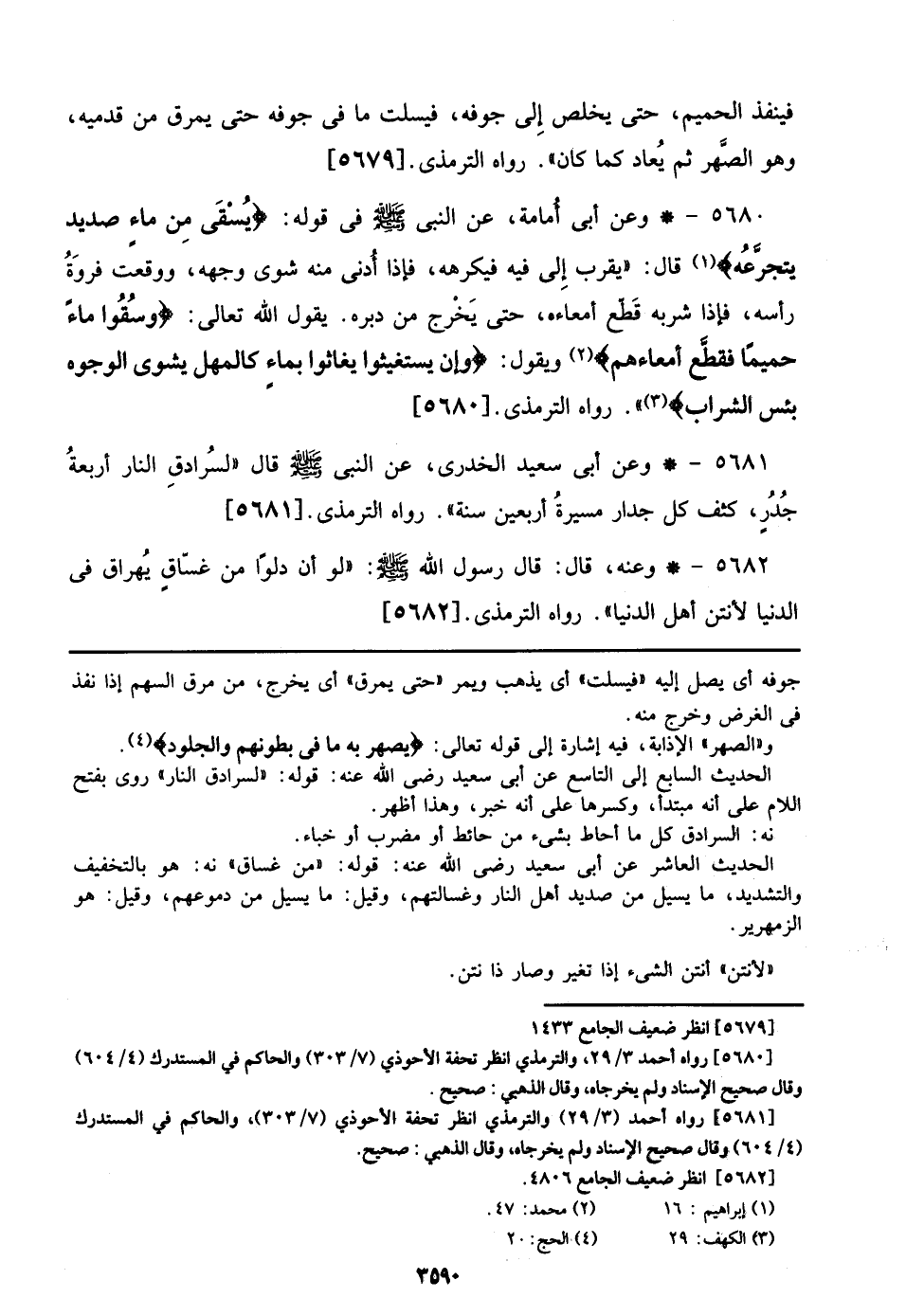 5680 - وعن أبي أُمامة، عن النبي صلى الله عليه وسلم في قوله: {يسقى من ماء صديد يتجرعه} قال: ((يقرب إلى فيه يكرهه، فإذا أدنى منه شوى وجهه، ووقعت فروة رأسه، فإذا شربه قطع أمعاءه، حتى يَخْرج من دبره. يقول الله تعالى: {وسُقُوا ماء حميمًا فقطع أمعاءهم} ويقول: {وإن يستغيثوا يغاثوا بماءٍ كالمهل يشوي الوجوه بئس الشراب})). رواه الترمذي. [5680]