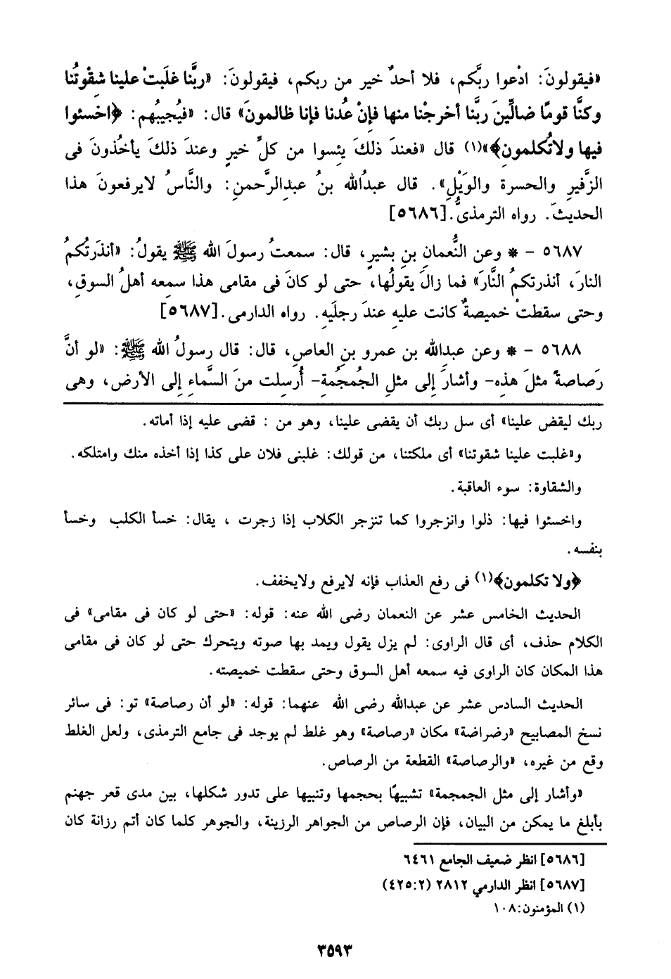 ((فيقولون: ادعوا ربكم، فلا أحدٌ خير من ربكم، فيقولون: ((ربنا غلبت علينا شقوتنا وكنا قومًا ضالين ربنا أخرجنا منها فإن عُدنا فإنا ظالمون)) قال: ((فيجيبُهم: {اخسئوا فيها ولاتكلمون} قال ((فعند ذلك يئسوا من كل خير وعند ذلك بأخذون في الزفير والحسرة والويل)). قال عبد الله بن عبد الرحمن: والناسُ لا يرفعون هذا الحديث. رواه الترمذي. [5686]