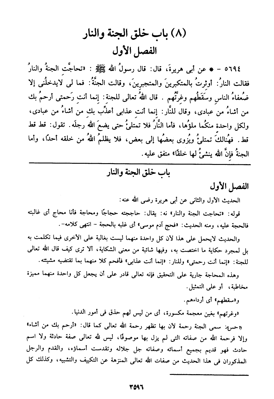 5694 - عن أبي هريرة، قال: قال رسول الله صلى الله عليه وسلم: ((تحاجت الجنة والنار فقالت النار: أوثرت بالمتكبرين والمتجبرين، وقالت الجنة: فما لي لايدخلني إلا ضعفاء الناس وسقطهم وغرتهم. قال الله تعالى للجنة: إنما أنت رحمتي ارحم بك من أشاء من عبادي، وقال للنار: إنما أنت عذابي أعذب بك من أشاء من عبادي، ولكل واحدة منكما ملؤها، فأما النار فلا تمتليء حتى يضع الله رجله. تقول: قط قط قط. فهنالك تمتليء ويزوى بعضها إلى بعض، فلا يظلم الله من خلقه أحدًا، وأما الجنة فإن الله ينشيء لها خلقًا)) متفق عليه.