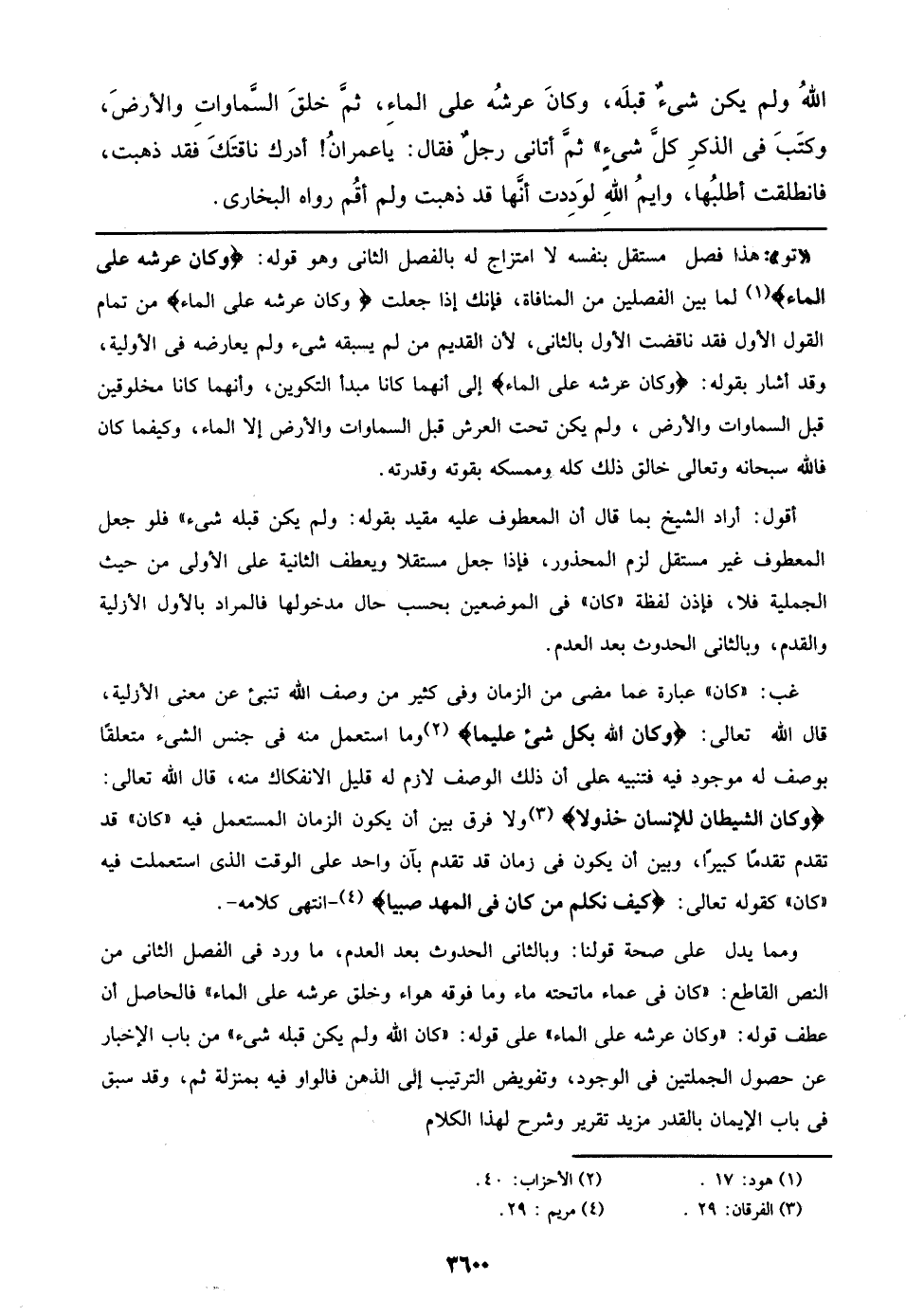ومما يدل على صحة قولنا: وبالثاني الحدوث بعد العدم، ما ورد في الفصل الثاني من النص القاطع: ((كان في عماء ما تحته ماء وما فوقه هواء وخلق عرشه على الماء)) فالحاصل أن عطف قوله: ((وكان عرشه على الماء)) على قوله: ((كان الله ولم يكن قبله شيء)) من باب الإخبار عن حصول الجملتين في الوجود، وتفويض الترتيب إلى الذهن فالواو فيه بمنزلة ثم، وقد سبق في باب الإيمان بالقدر مزيد تقرير وشرح لهذا الكلام