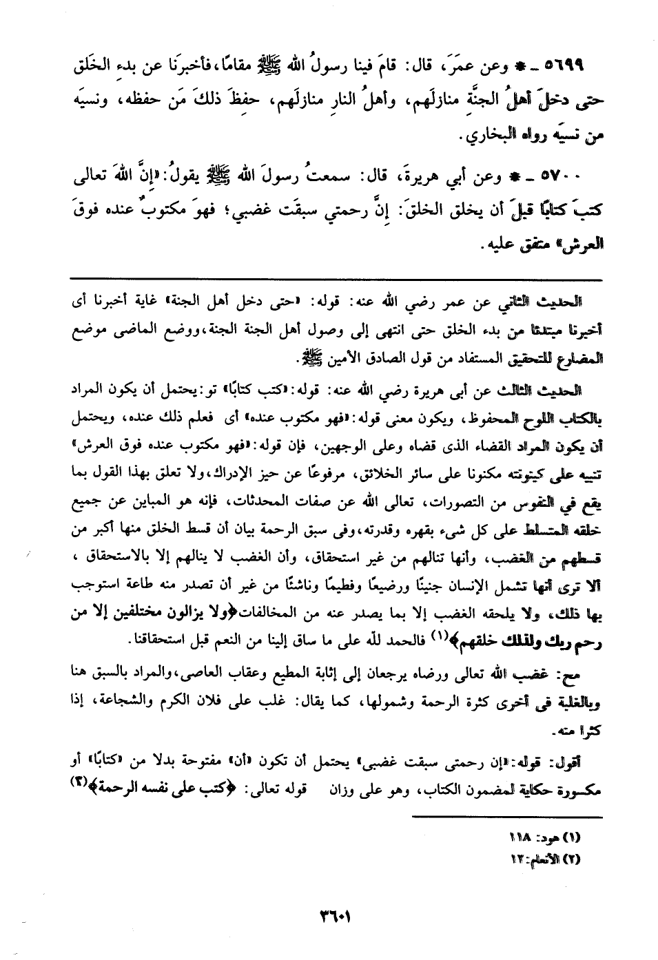 الحديث الثالث عن أبي هريرة رضي الله عنه: قوله: ((كتب كتابًا)) تو: يحتمل أن يكون المراد بالكتاب اللوح المحفوظ، ويكون معنى قوله: ((فهو مكتوب عنده)) أي فعلم ذلك عنده، ويحتمل أن يكون المراد القضاء الذي قضاه وعلى الوجهين، فإن قوله: ((فهو مكتوب عنده فوق العرش)) تنبيه على كينونته مكنونا على سائر الخلائق، مرفوعًا عن حيز الإدراك، ولا تعلق بهذا القول بما يقع في النفوس من التصورات، تعالى الله عن صفات المحدثات، فإنه هو المباين عن جميع خلقه المتسلط على كل شيء بقهره وقدرته، وفي سبق الرحمة بيان أن قسط الخلق منها أكبر من قسطهم من الغضب، وأنها تنالهم من غير استحقاق، وأن الغضب لا ينالهم إلا بالاستحقاق، ألا ترى أنها تشمل الإنسان جنينًا ورضيعًا وفطيمًا وناشئًا من غير أن تصدر منه طاعة استوجب بها ذلك، ولا يلحقه الغضب إلا بما يصدر عنه من المخالفات {ولا يزالون مختلفين إلا من رحم ربك ولذلك خلقهم} فالحمد لله على ما ساق إلينا من النعم قبل استحقاقنا.