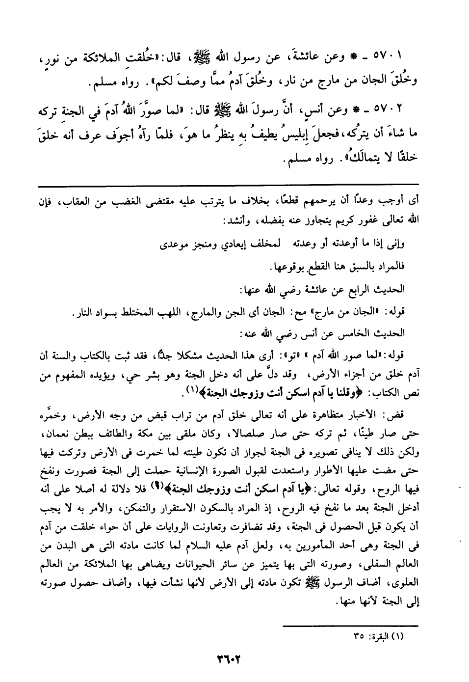 5701 - وعن عائشة، عن رسول الله صلى الله عليه وسلم قال: ((خُلقت الملائكة من نور، وخُلقَ الجان من مارج من نار، وخُلقَ آدمُ مما وصف لكم)). رواه مسلم.