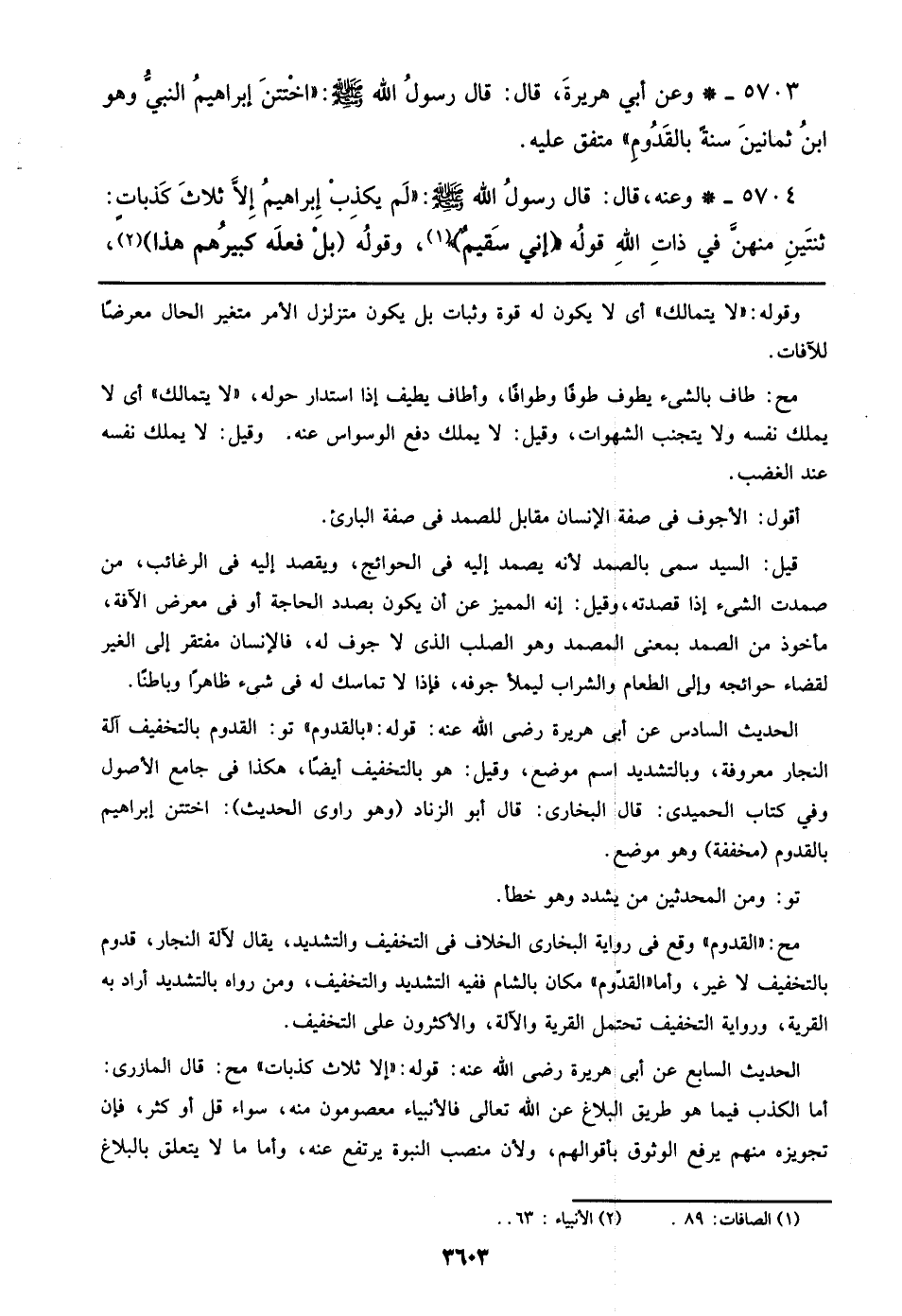 الحديث السادس عن أبي هريرة رضي الله عنه: قوله: ((بالقدوم)) تو: القدوم بالتخفيف آلة النجار معروفة، وبالتشديد اسم موضع، وقيل: هو بالتخفيف أيضًا، هكذا في جامع الأصول وفي كتاب الحميدي: قال البخاري: قال أبو الزناد (وهو راوي الحديث): اختتن إبراهيم بالقدوم (مخففة) وهو موضع.