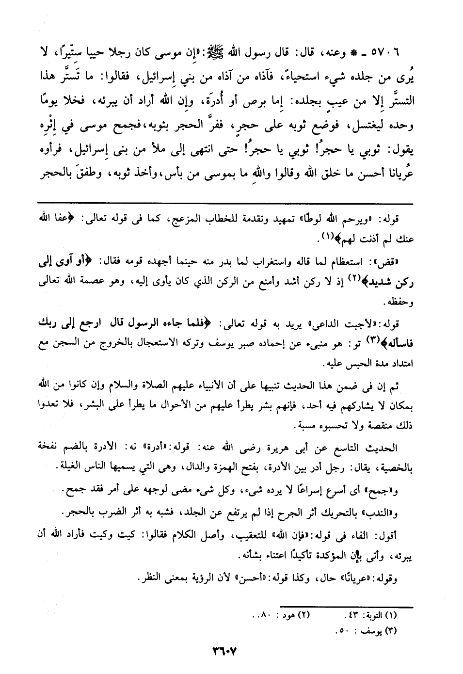 5706 - وعنه، قال: قال رسول الله صلى الله عليه وسلم: ((إن موسى كان رجلا حييا ستيرًا، لا يُرى من جلده شيء استحياء، فآذاه من آذاه من بني إسرائيل، فقالوا: ما تستر هذا التستر إلا من عيب بجلده: إما برص أو أدرة، وإن الله أراد أن يبرئه، فخلا يومًا وحده ليغتسل، فوضع ثوبه على حجر، ففر الحجر بثوبه، فجمح موسى في إثره يقول: ثوبي يا حجرُ! ثوبي يا حجرُ! حتى انتهى إلى ملأ من بني إسرائيل، فرأوه عُريانا أحسن ما خلق الله وقالوا والله ما بموسي من بأس، وأخذ ثوبه، وطفق بالحجر