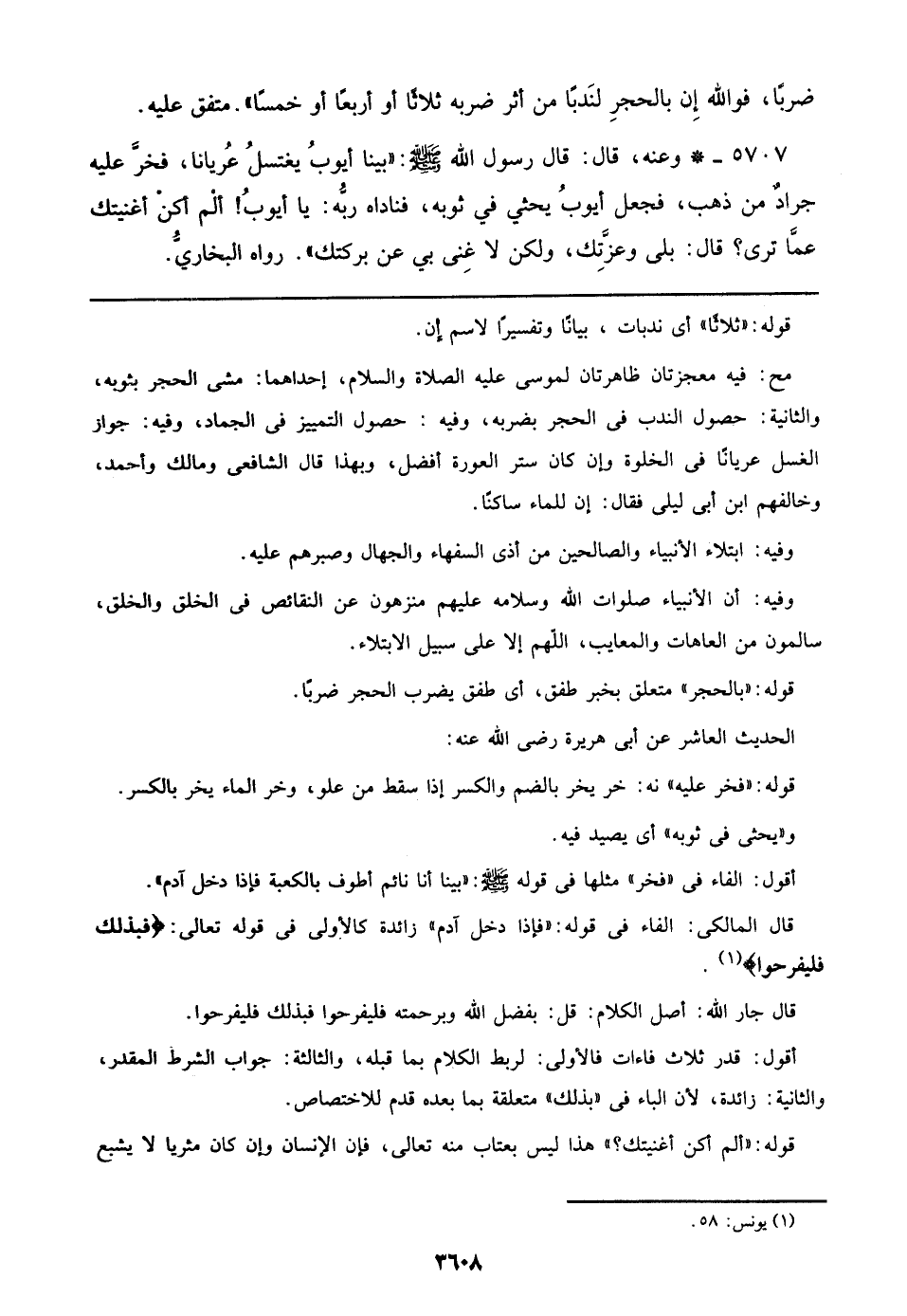 5707 - وعنه، قال: قال رسول الله صلى الله عليه وسلم: ((بينا أيوب يغتسل عُريانا، فخر عليه جرادٌ من ذهب، فجعل أيوبُ يحثي في ثوبه، فناداه ربه: يا أيوبُ! ألم أكن أغنيتك عما ترى؟ قال: بلى وعزتك، ولكن لا غنى بي عن بركتك)). رواه البخاري.